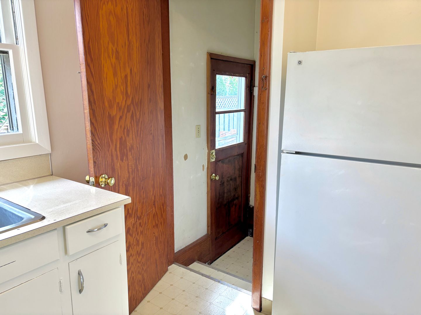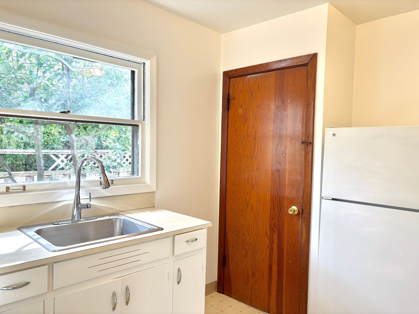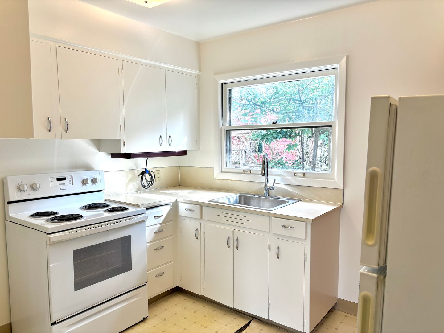 - Kitchen with lots of light, shelving, fridge, electric range