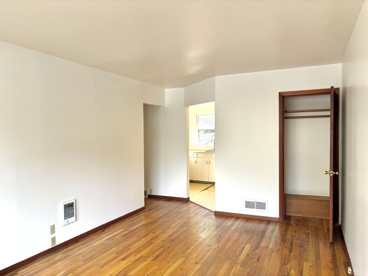 - Hardwood floors throughout main living area, linoleum in kitchen and bath