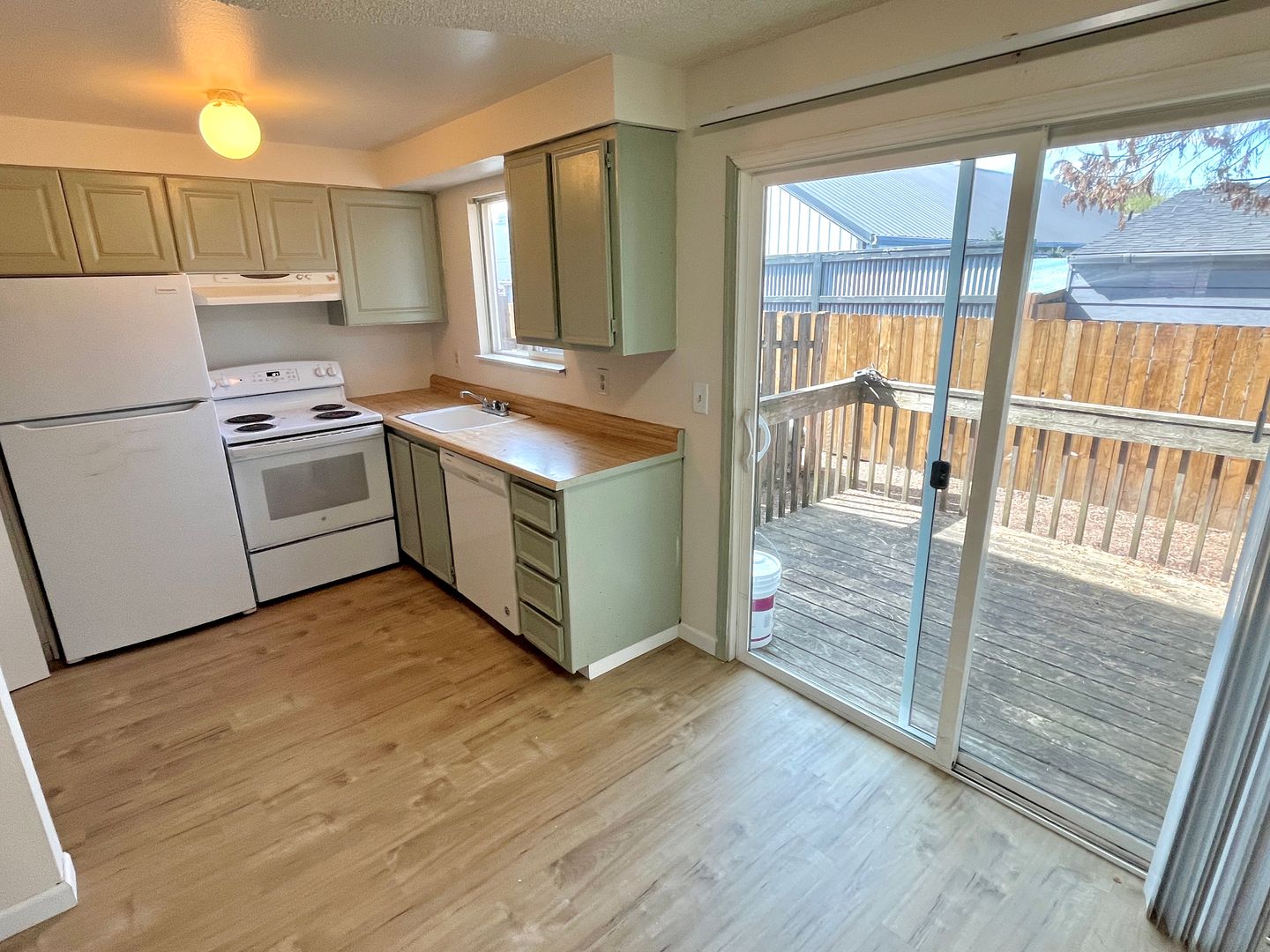 - Glass sliding door off of the dining area leads to a private deck and small yard