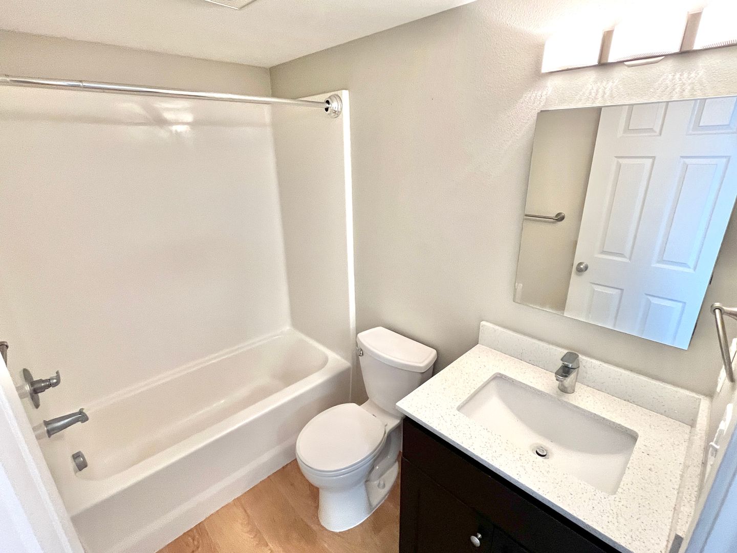 - Updated bathroom with full shower/tub and one-piece surround, vanity, vent fan