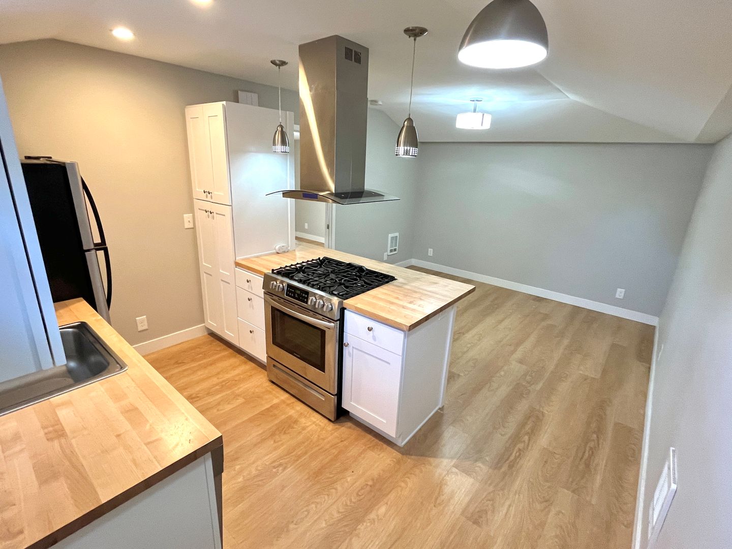 - Updated kitchen with wood countertops, stainless steel gas range, vent hood, full-size refrigerator, and dishwasher