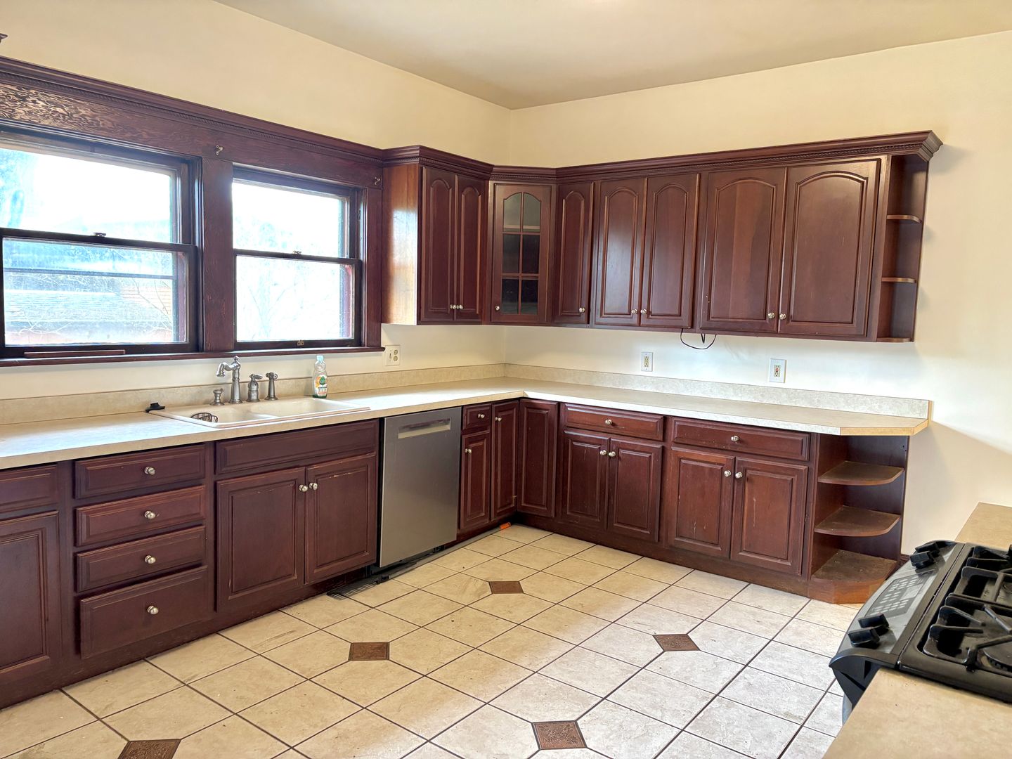 - Full kitchen with plenty of cabinet space for storage, includes stainless steel appliances- refrigerator, gas range, and dishwasher