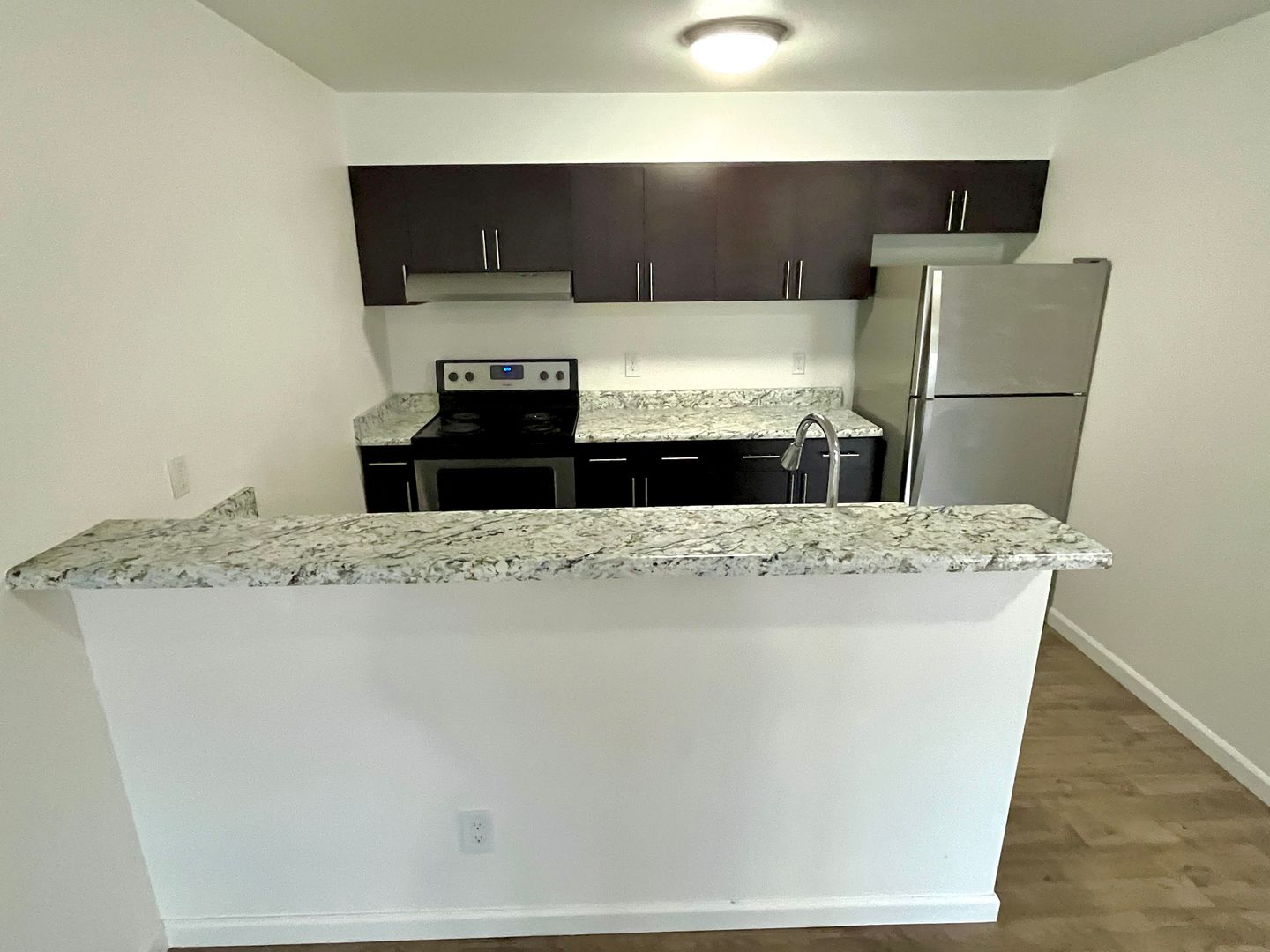 - Granite countertop serving bar facing living room area