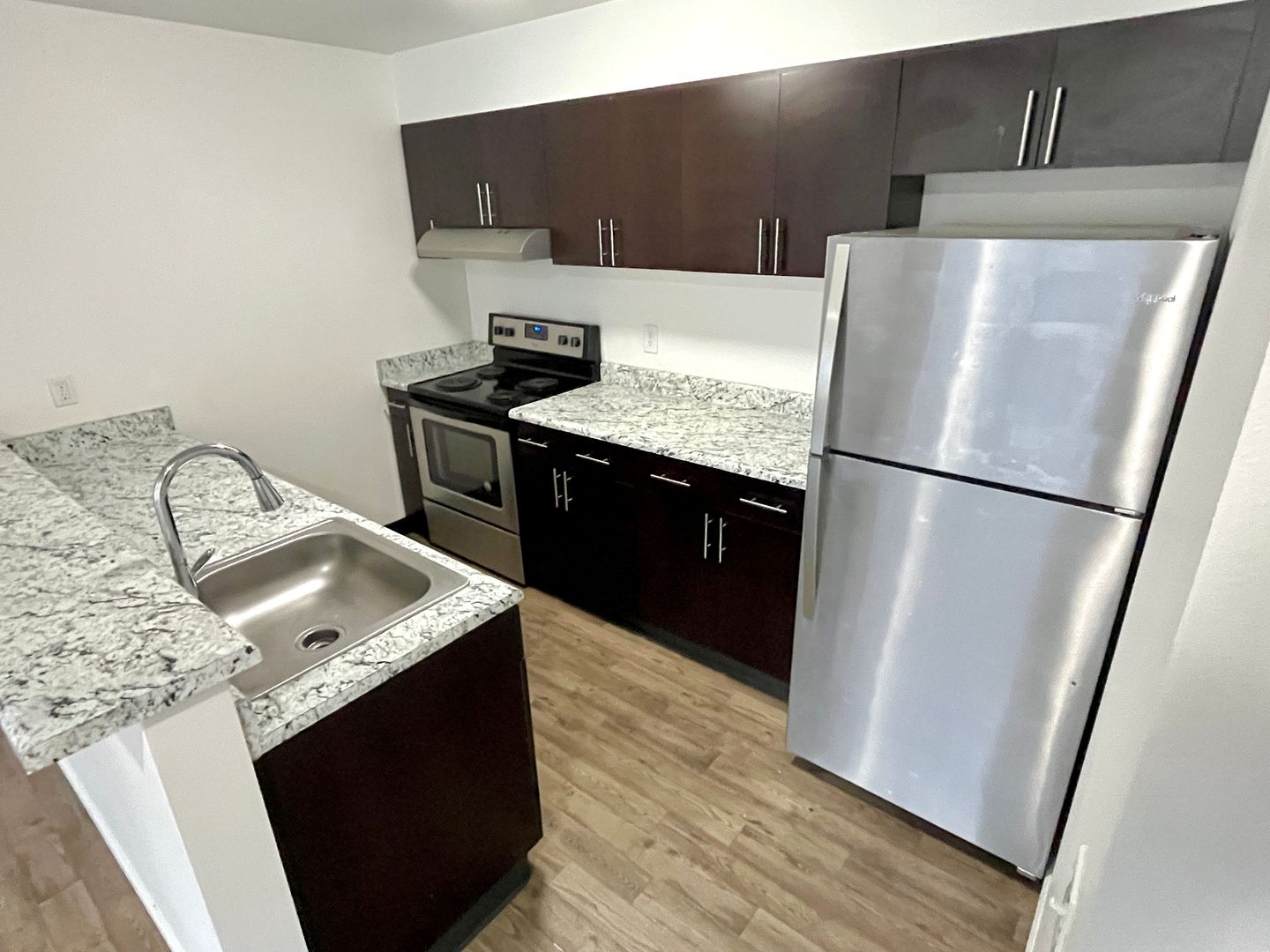 - Efficient kitchen layout with plenty of cabinet space, stainless refrigerator, coil top electric range and dishwasher