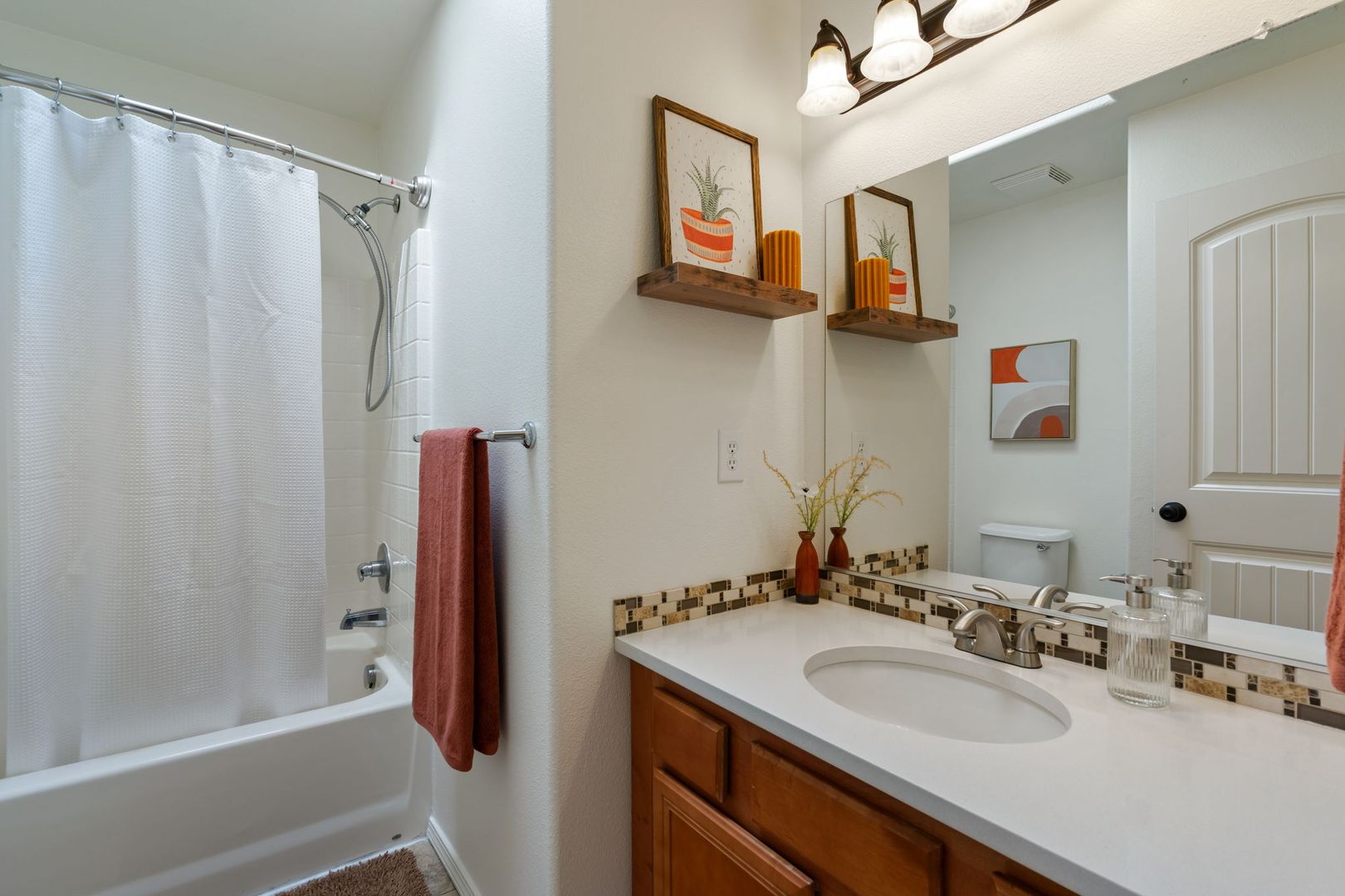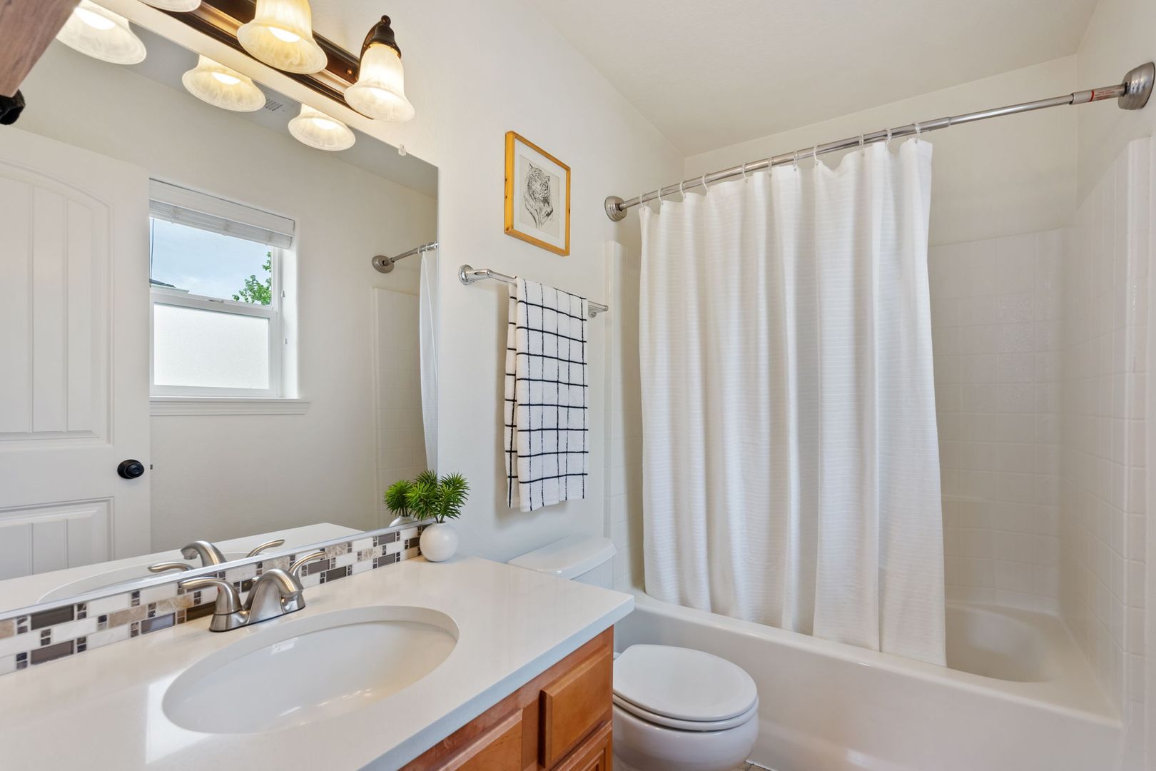 - Common area bathroom with tiled flooring, full-sized shower/tub, skylight