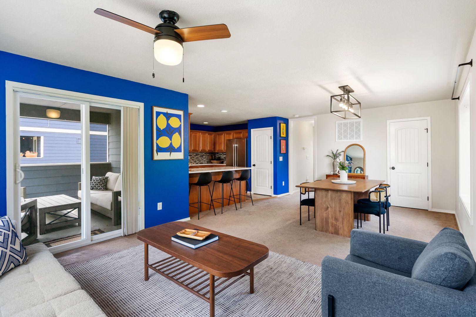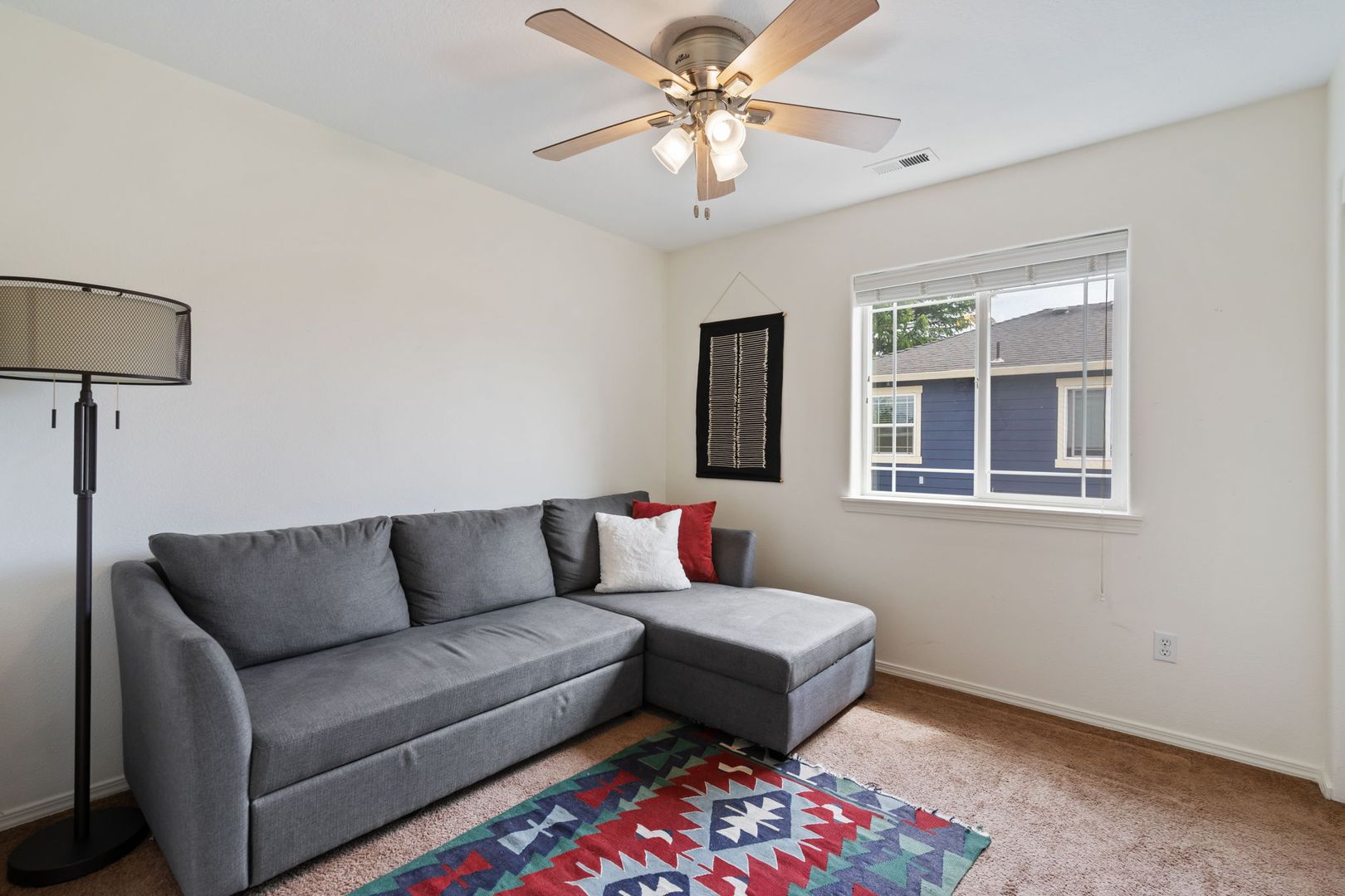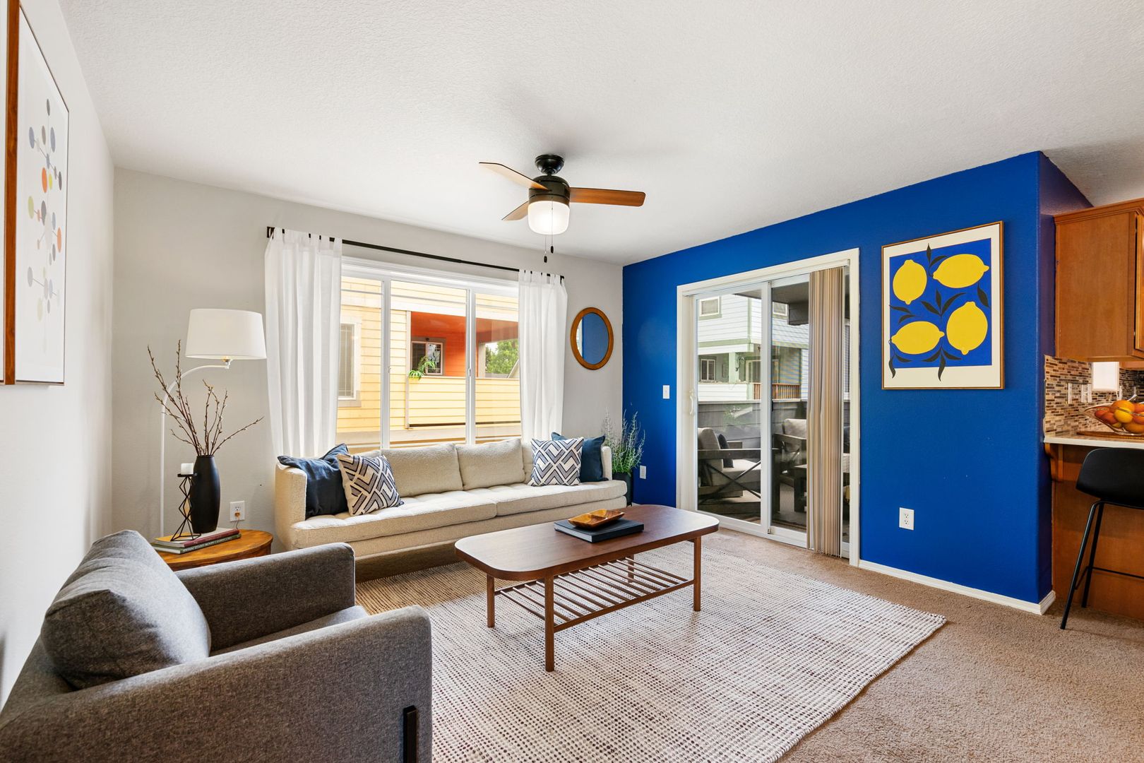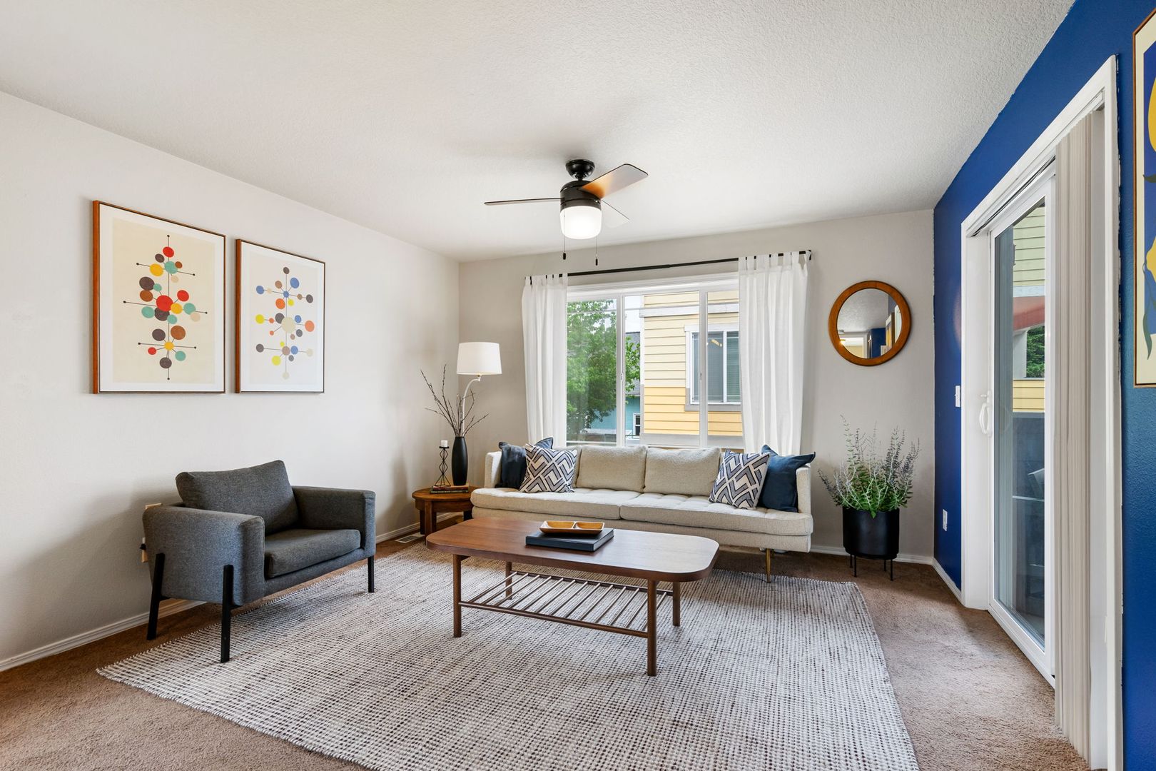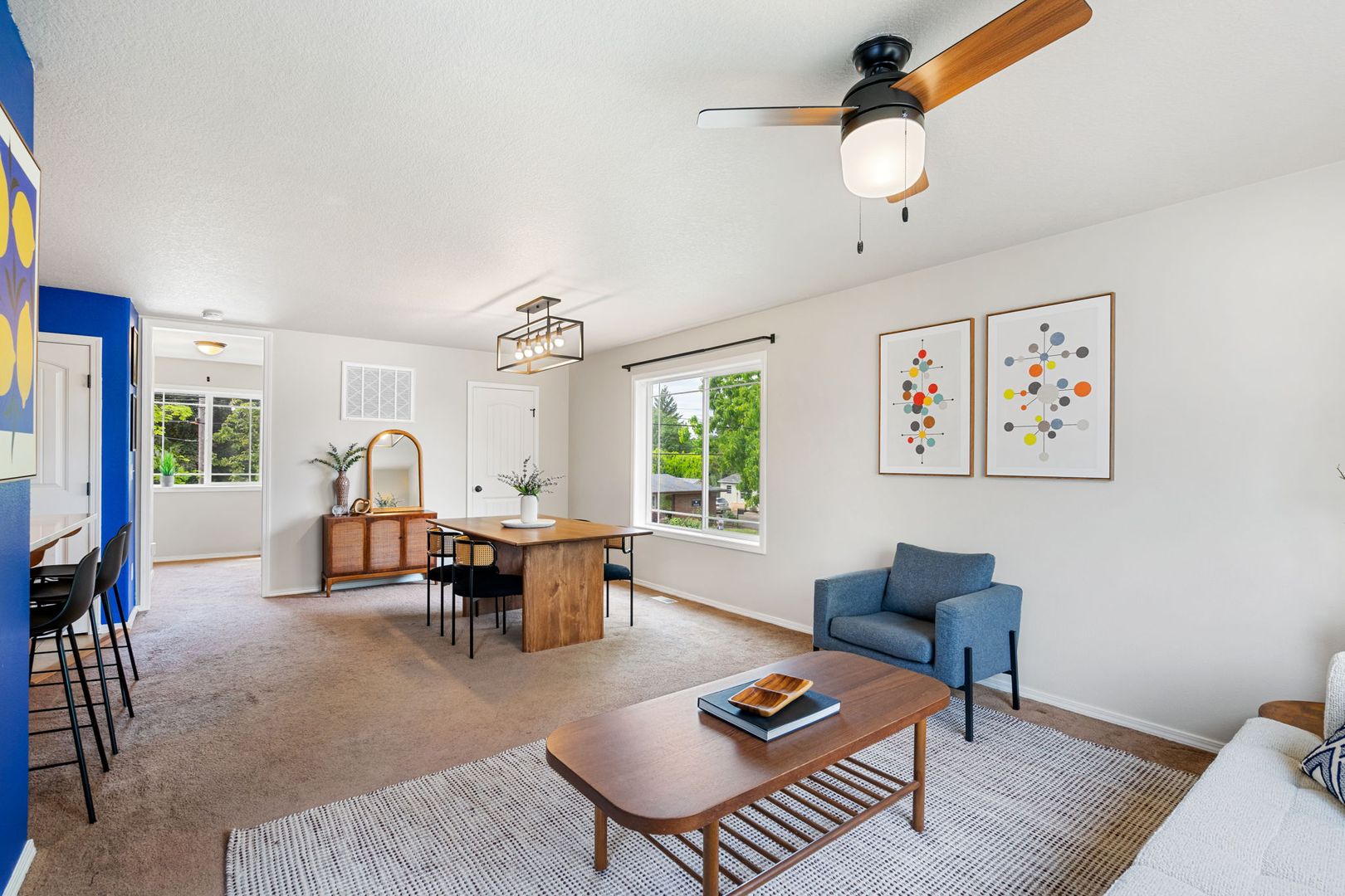 - Spacious living room, carpeted throughout, open to kitchen, with slider door to covered patio