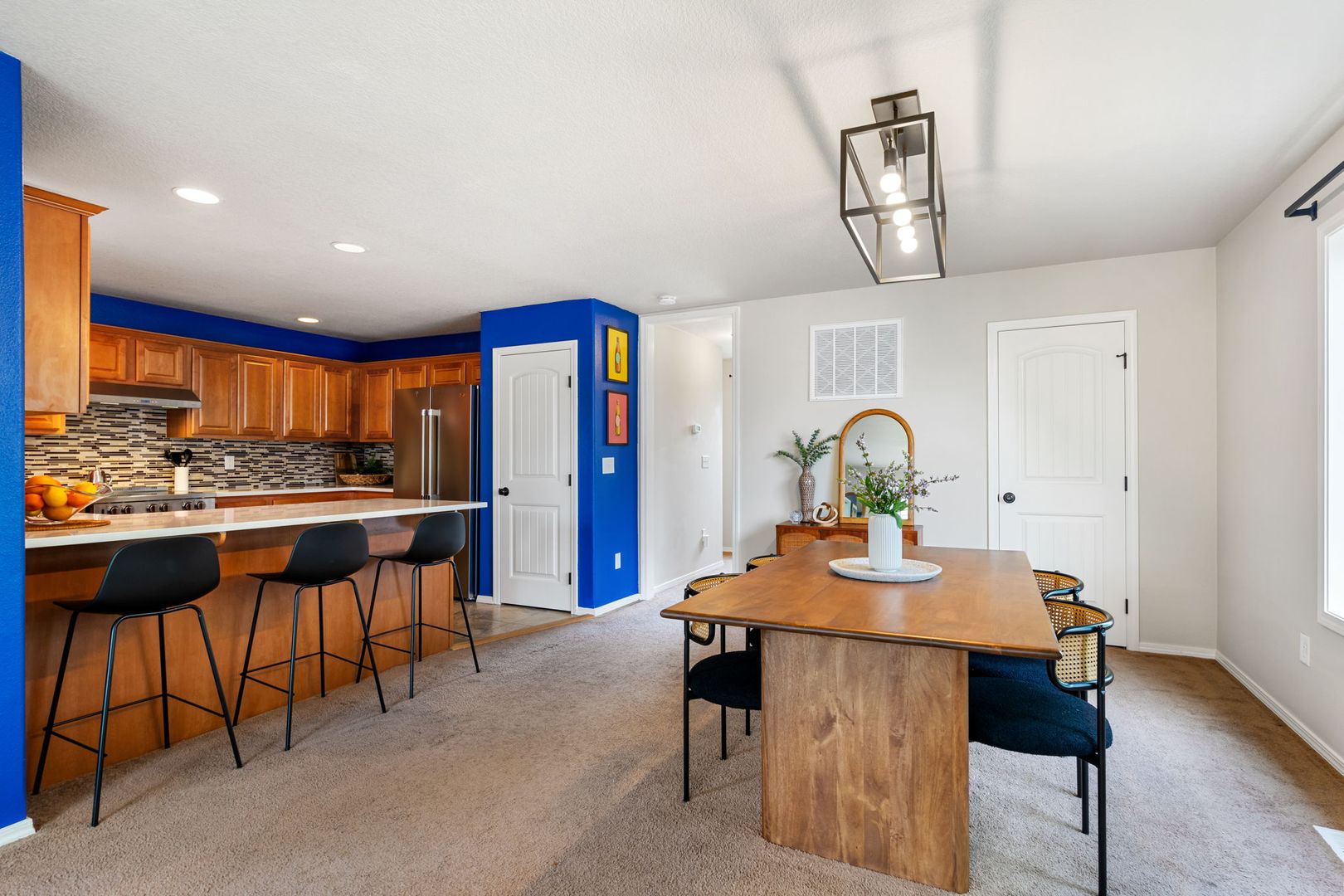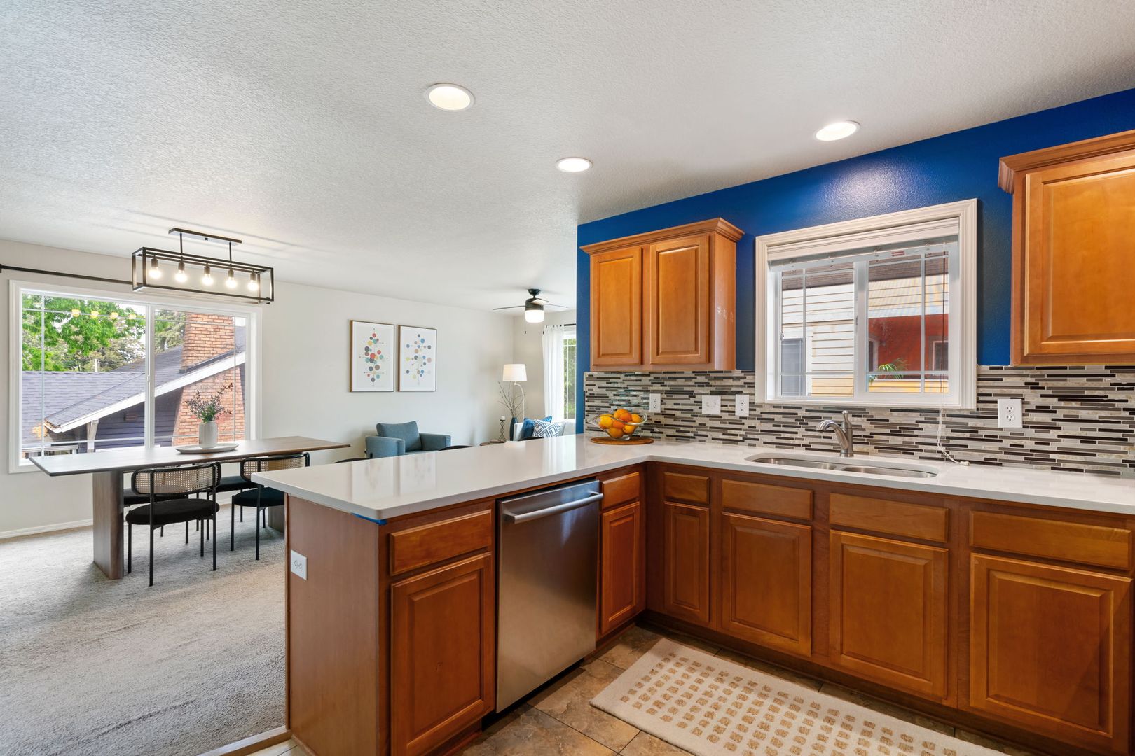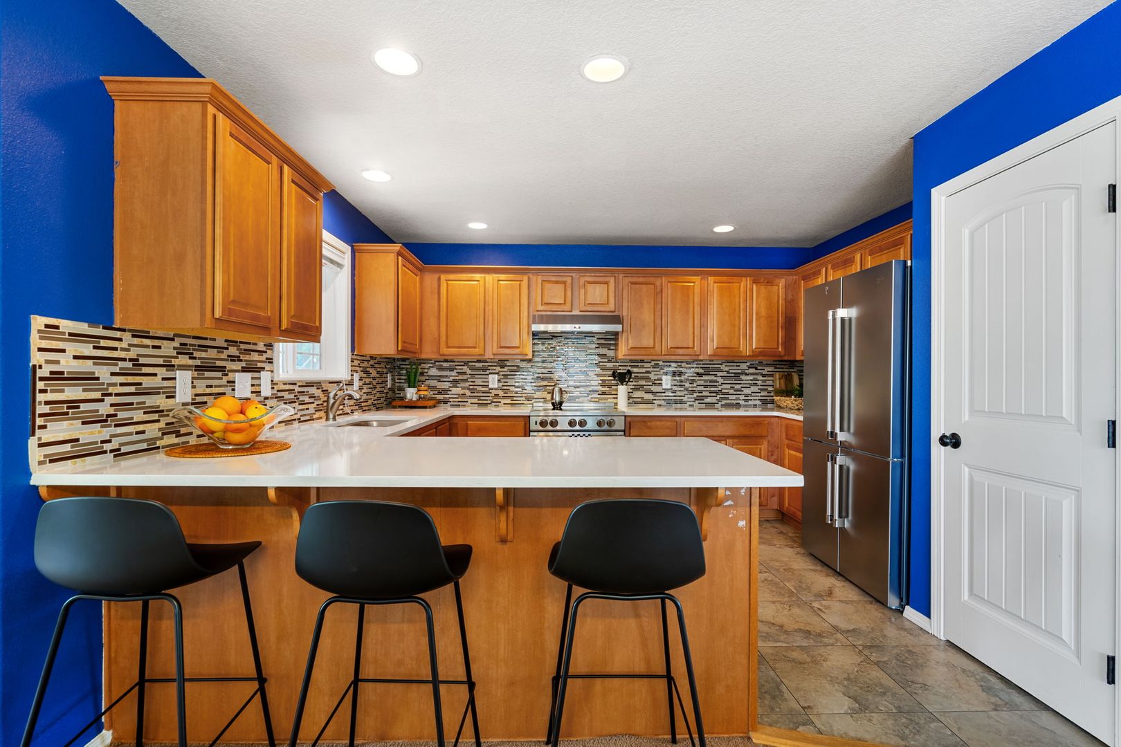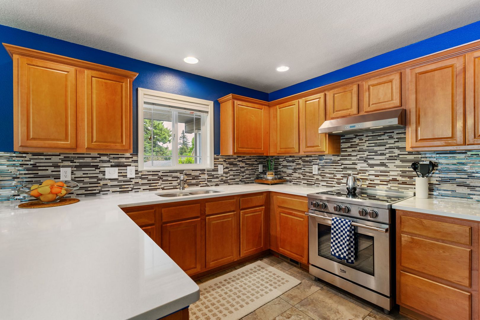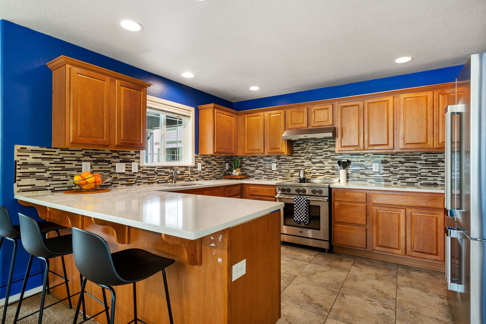 - Updated kitchen with quartz countertops, tiled backsplash, counter seating facing living room, French door stainless steel refrigerator, stainless steel induction cooktop (requires magnetic cookware) and electric oven, vent hood, garbage disposal, and large food pantry