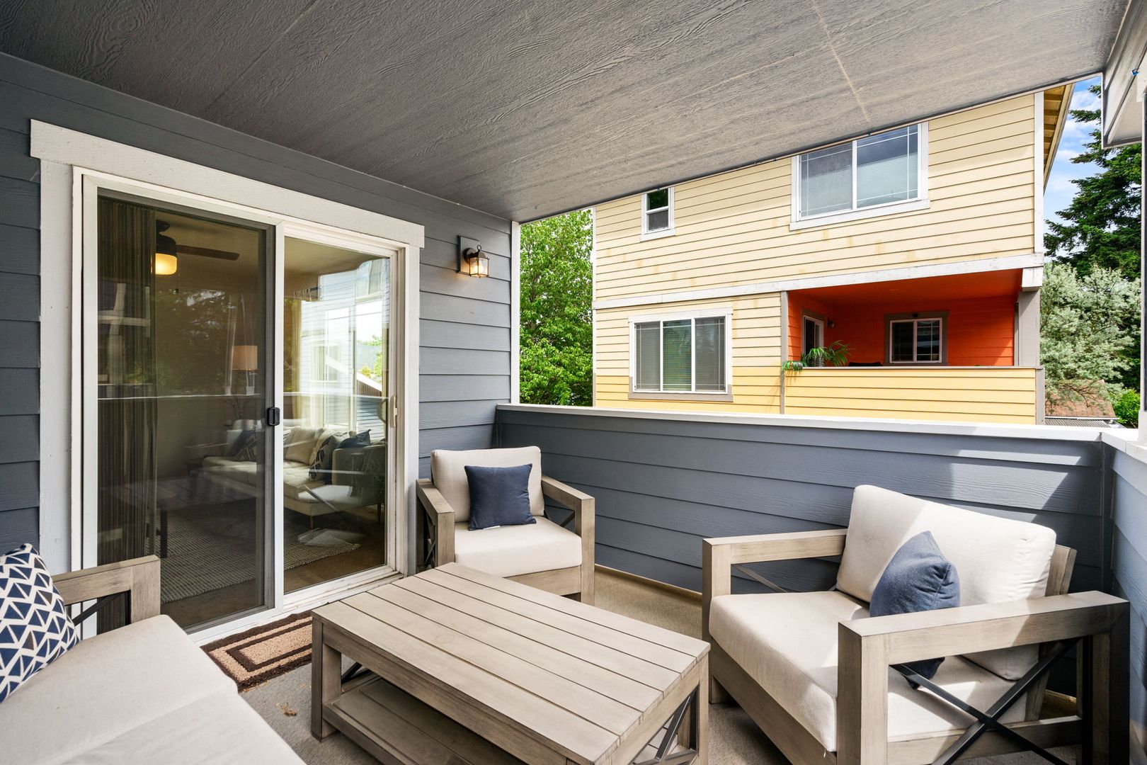- Covered porch overlooking courtyard space of community (patio furnishings can be left if desired)
