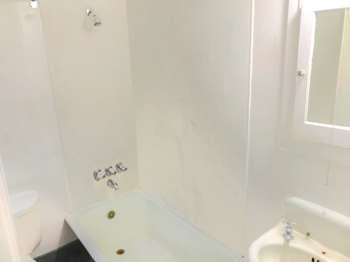 - Bath with tub, shower, and window for ventilation, linoleum flooring