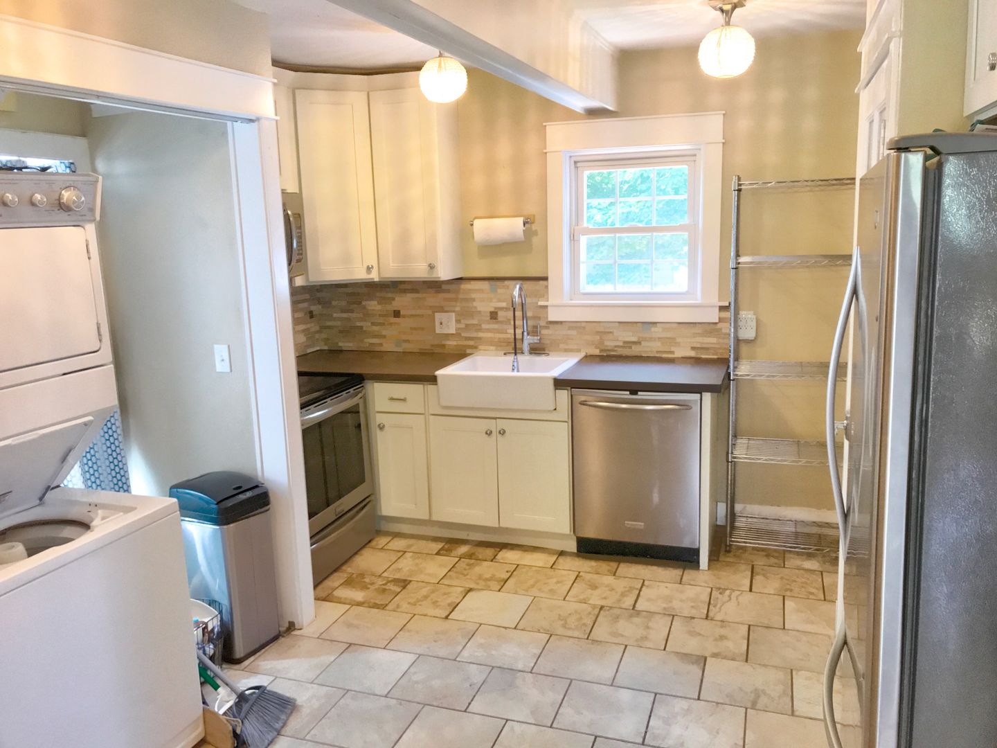 - Kitchen with tiled floor and backsplash, stainless steel fridge, range, built-in microwave and dishwasher, laundry closet with stackable W/D