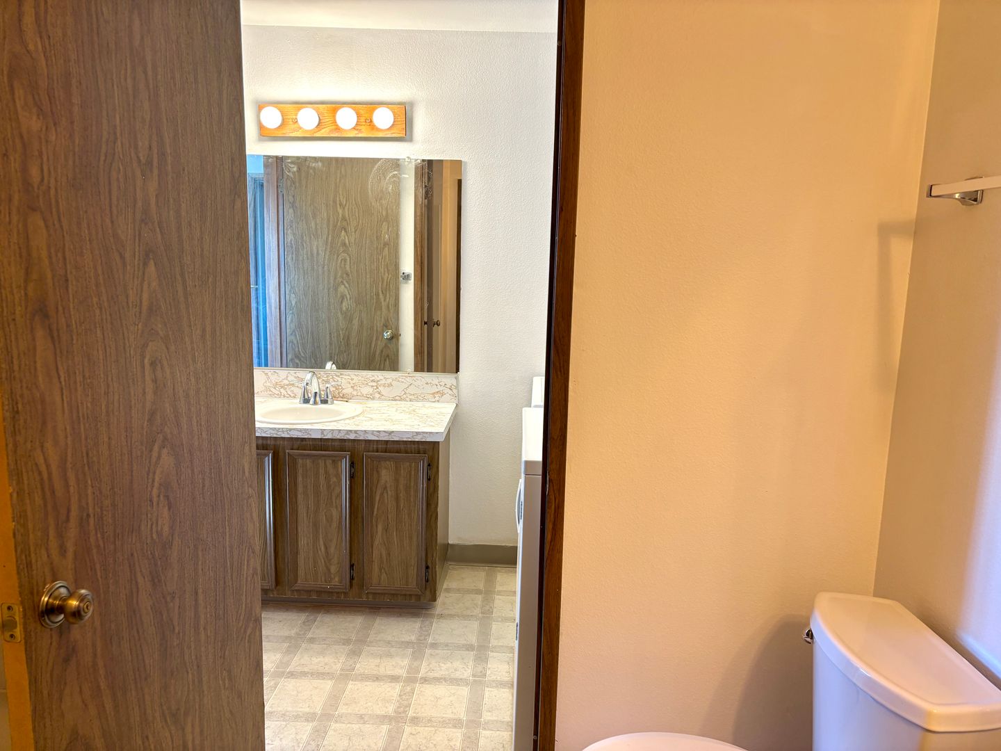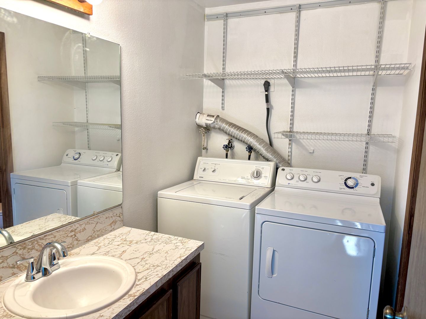 - Utility closet off of bathroom with washer/dryer (W/D) and additional sink