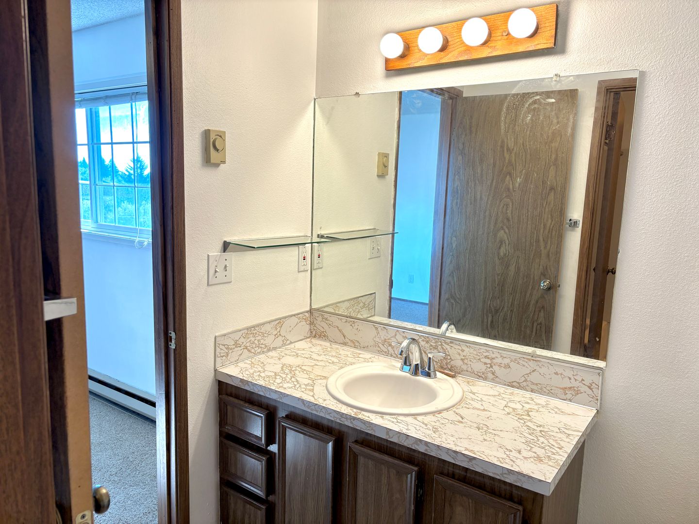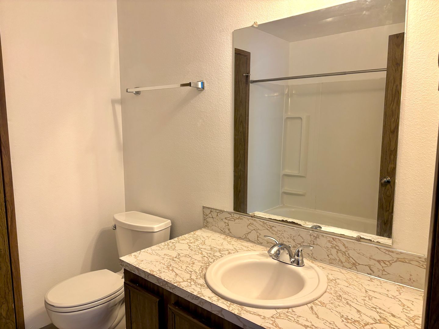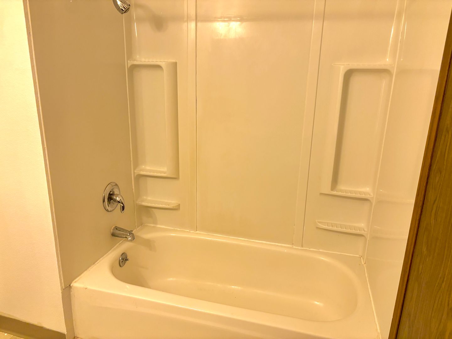 - Cute bathroom with full-size, vinyl surround shower/tub
