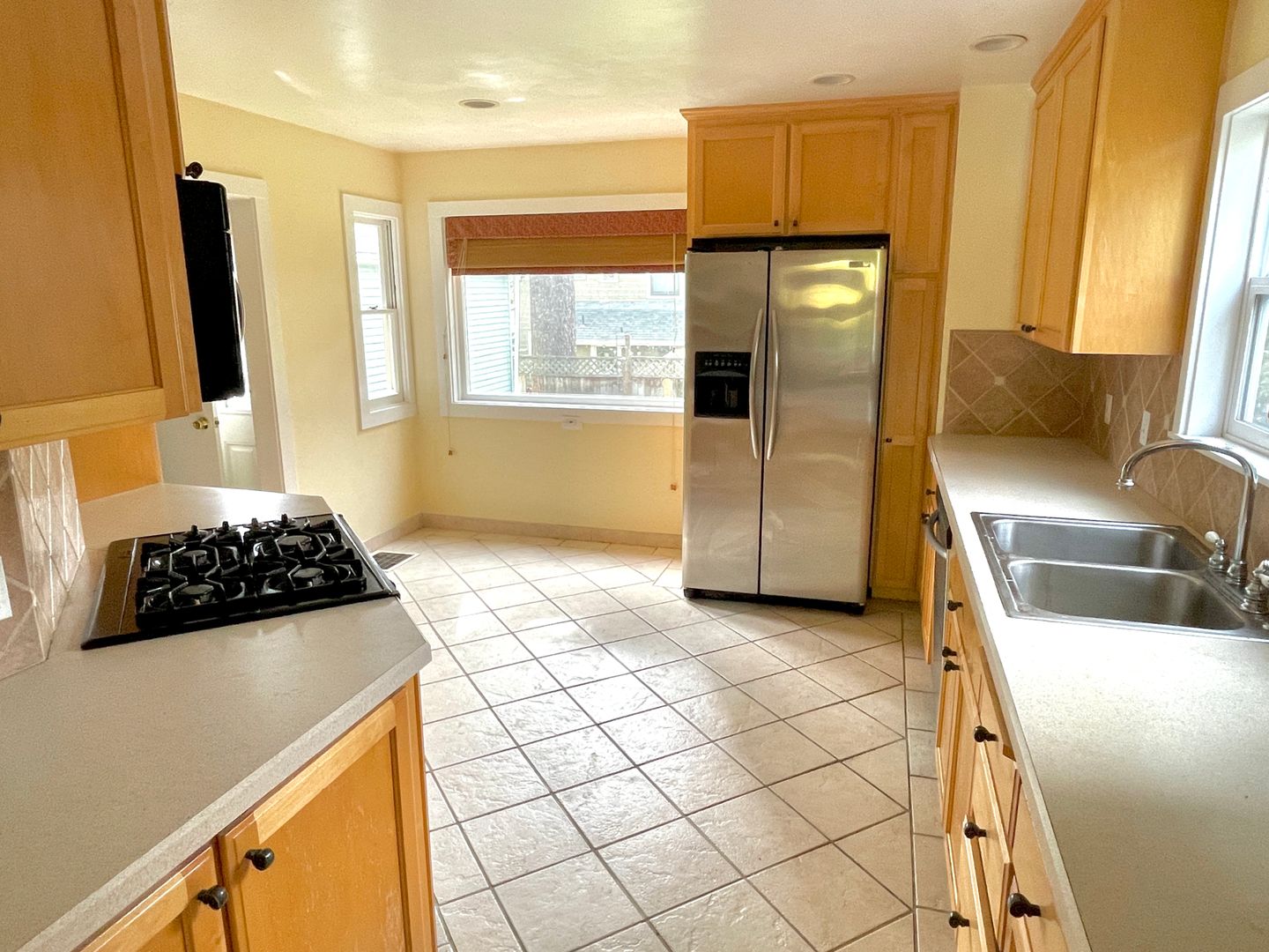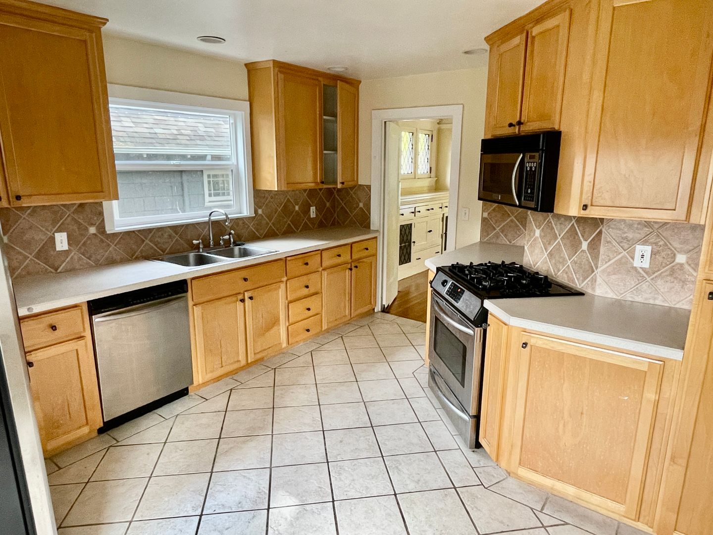 - Kitchen off of dining room with tiled floors, stainless fridge, dishwasher, gas range, built-in microwave, small table space