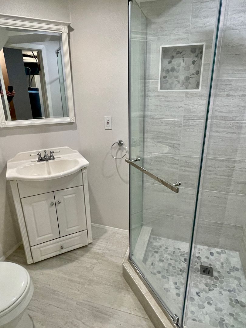 - Full bathroom in basement, with tiled, glass-enclosed shower stall