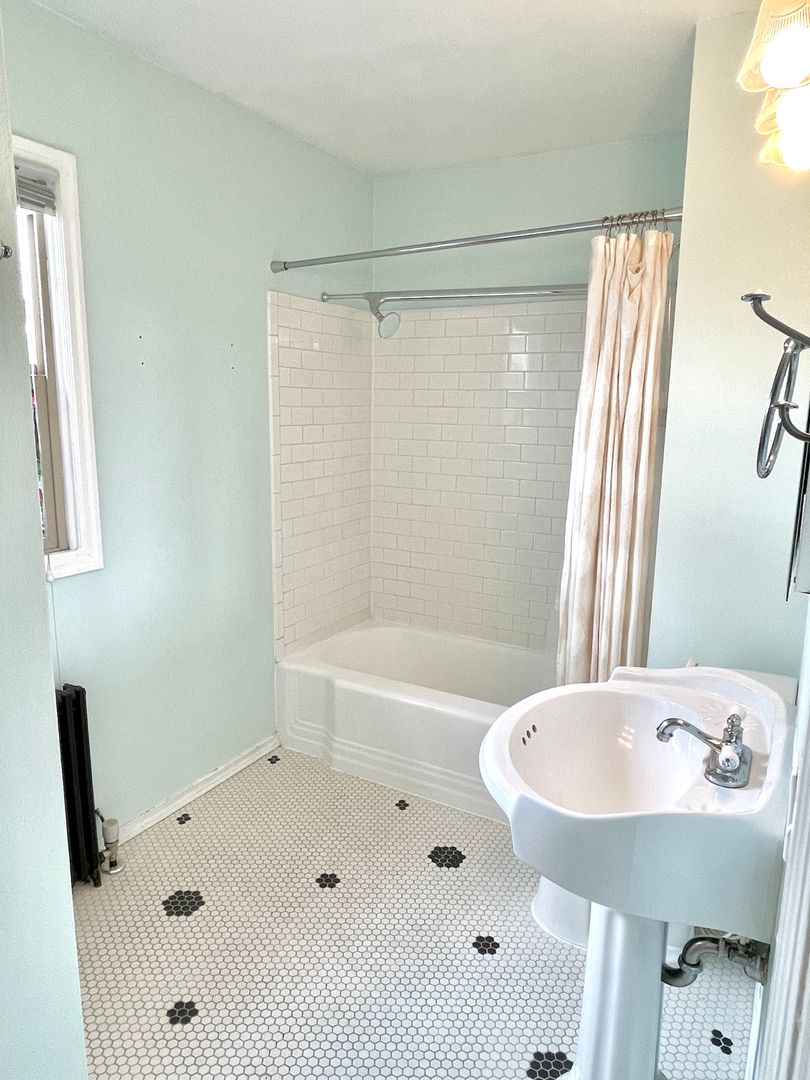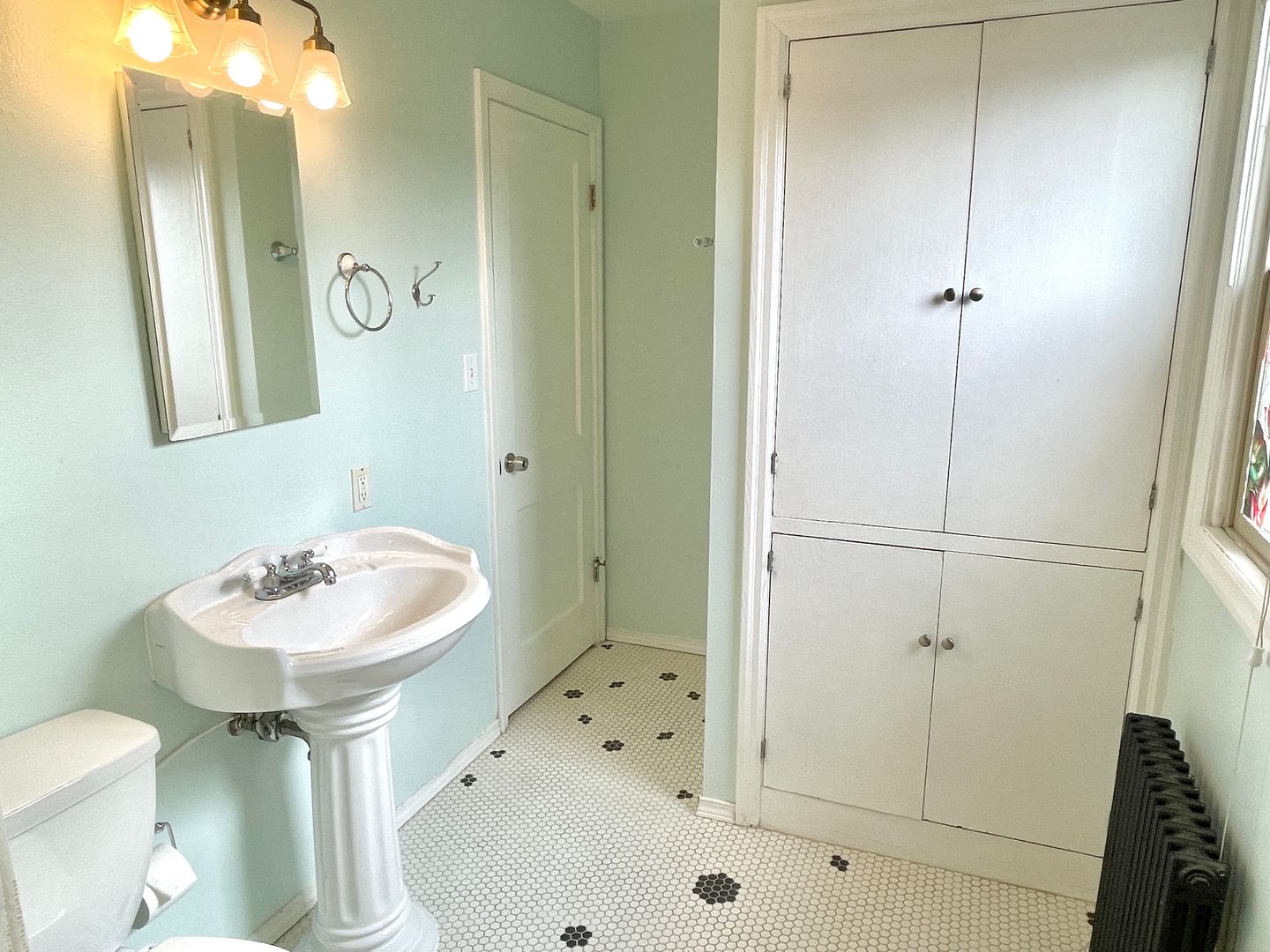 - Bathroom features hexagon tile flooring, pedestal sink, shower/tub and two large storage cupboards.