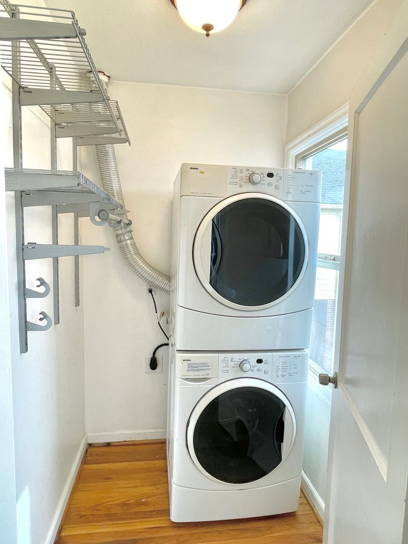 - In-unit stackable washer and dryer in a large closet off of the living room with shelving system for extra storage.