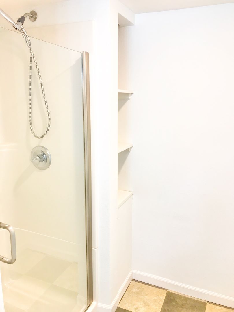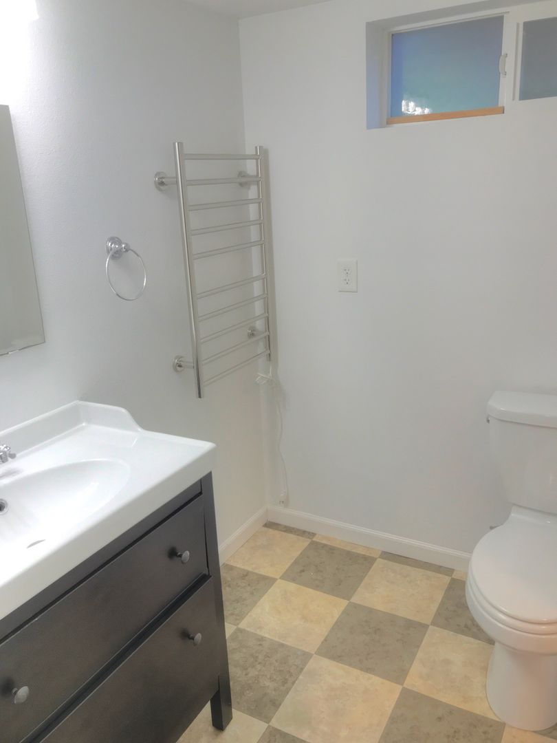- Remodeled bathroom with laminate flooring, shower stall, heated towel rack