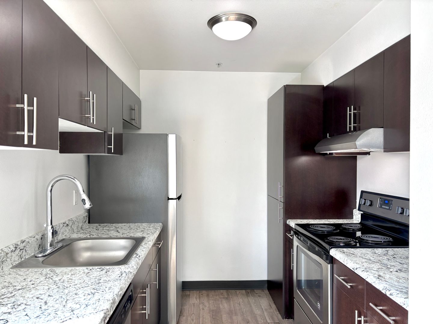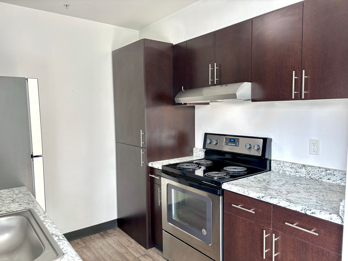 - Efficient kitchen layout with plenty of cabinet space, stainless refrigerator, coil top electric range and dishwasher