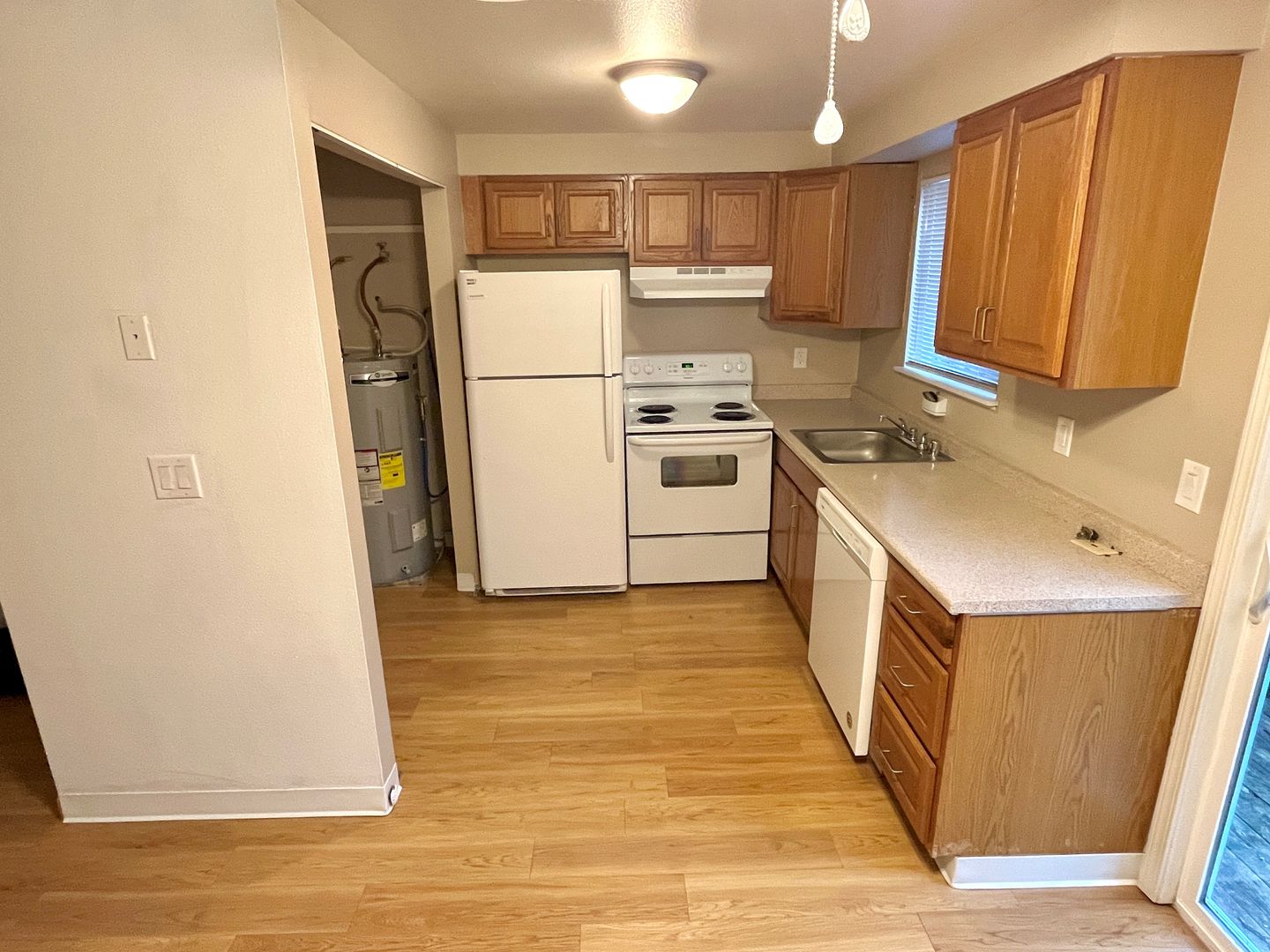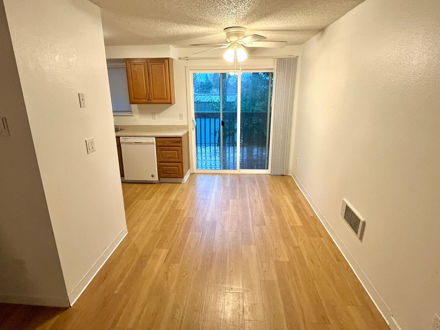 - The dining area flows into the kitchen, equipped with a dishwasher, electric range, full-sized refrigerator, and laundry closet with washer/dryer hookups
