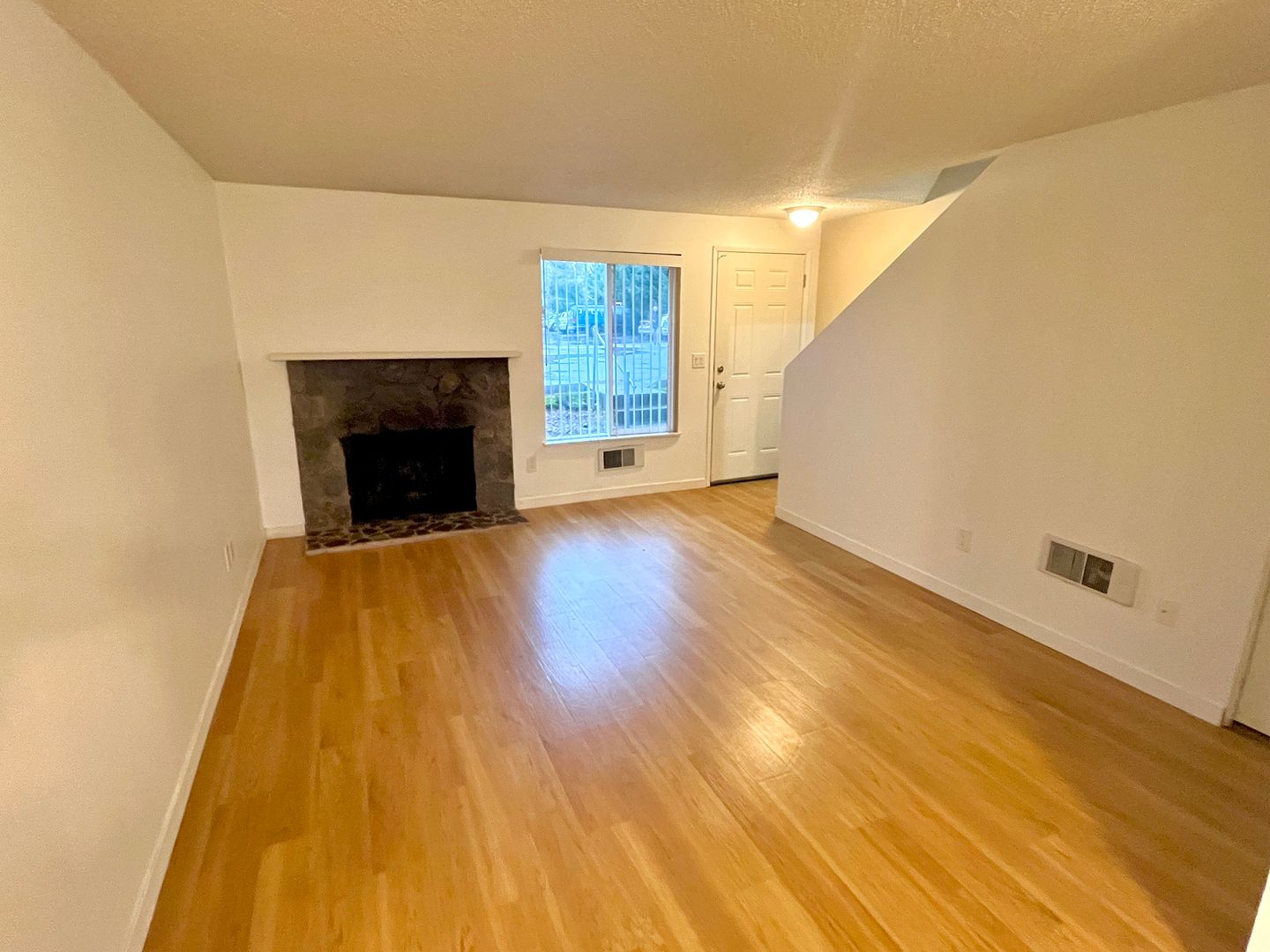 - Bright and spacious living room with decorative fireplace