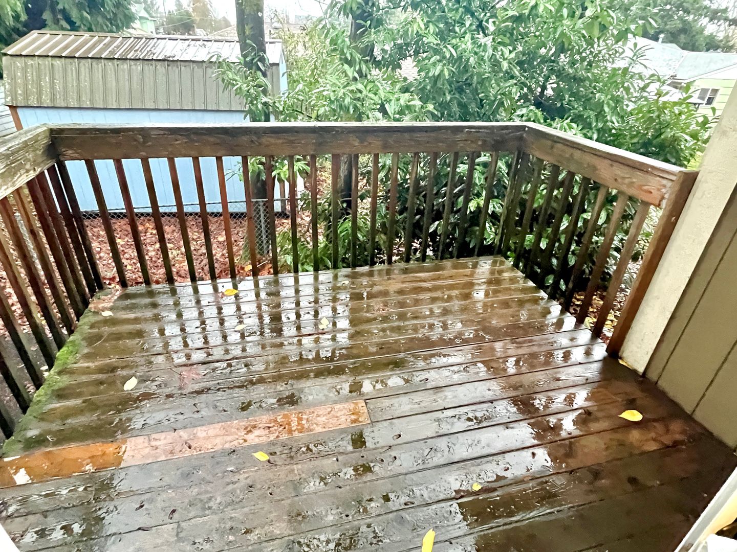 - Glass sliding door off of the dining area leads to a private deck and small yard