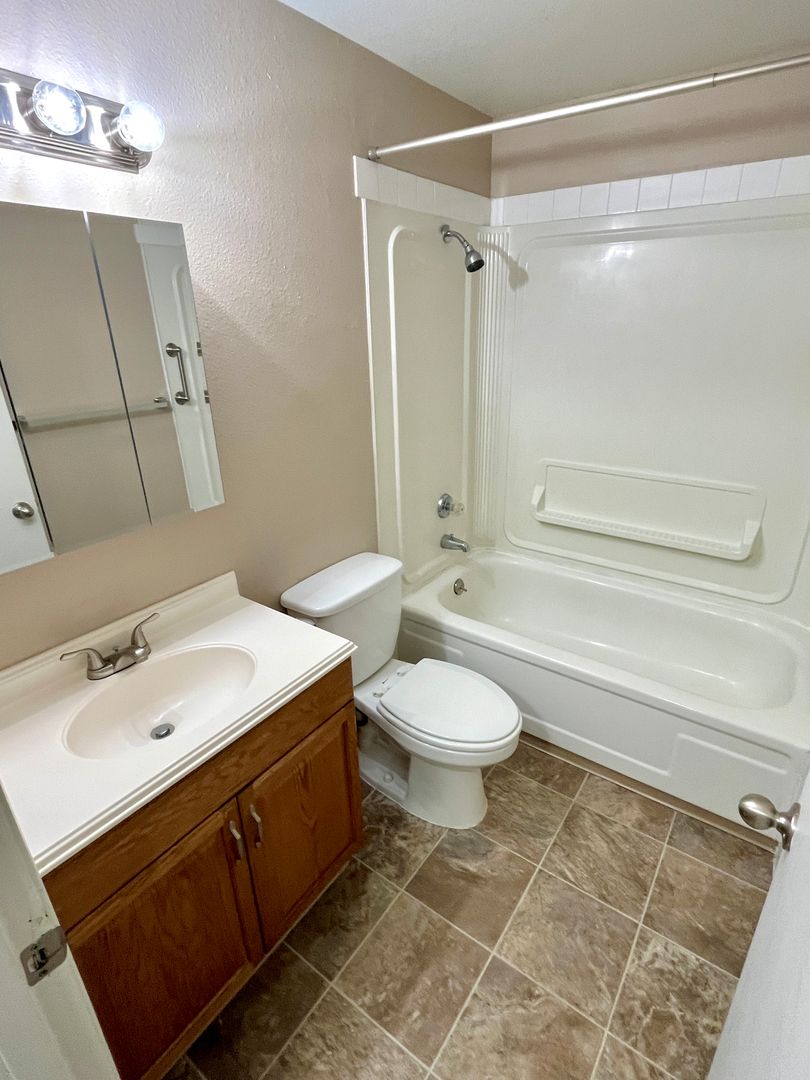 - Full bathroom with tub, shower, and LVP flooring