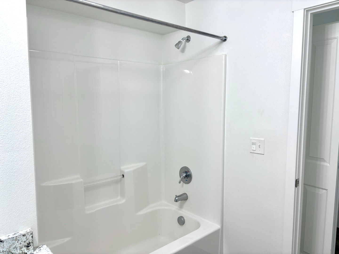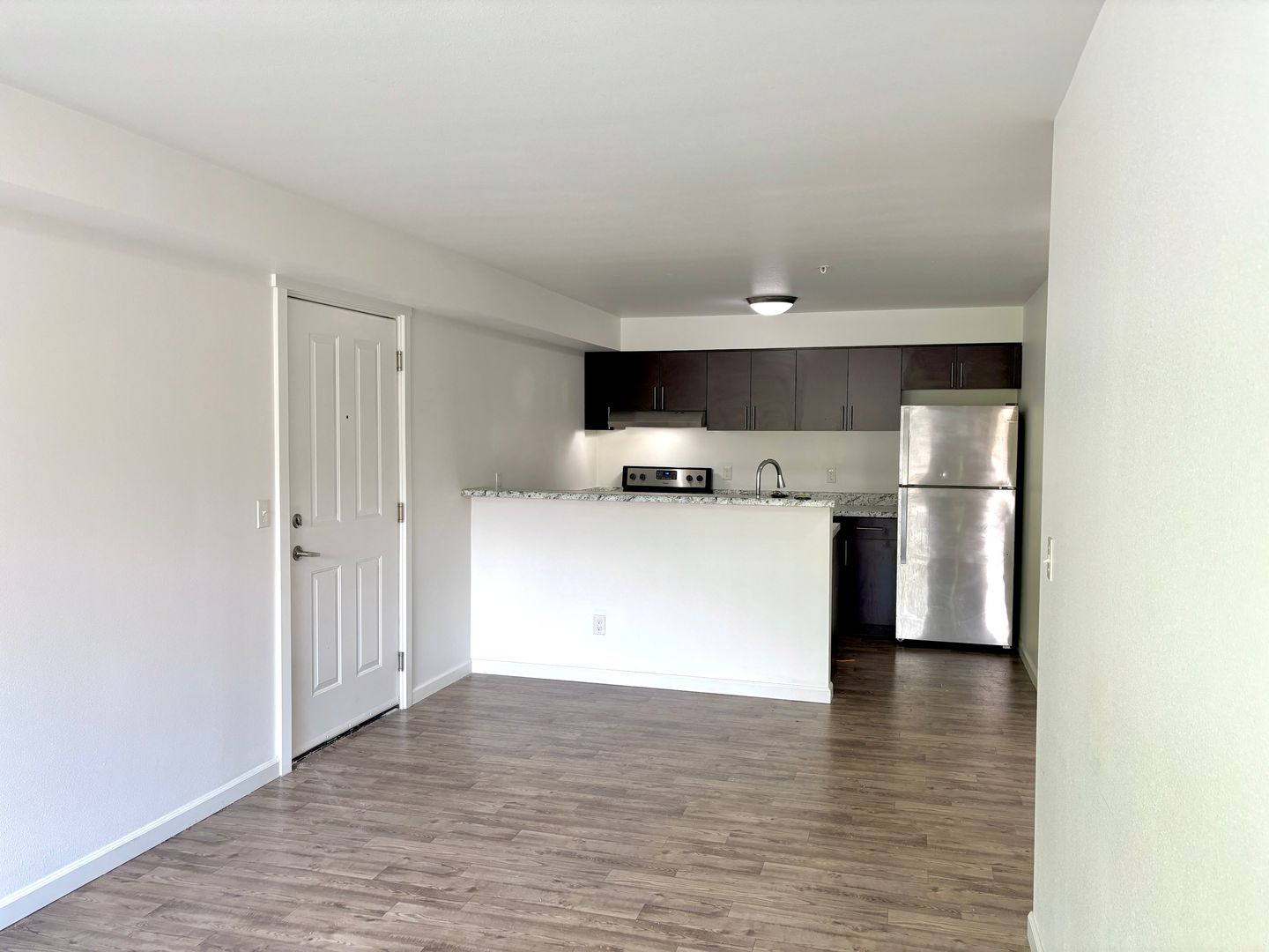 - Granite countertop serving bar facing living room area