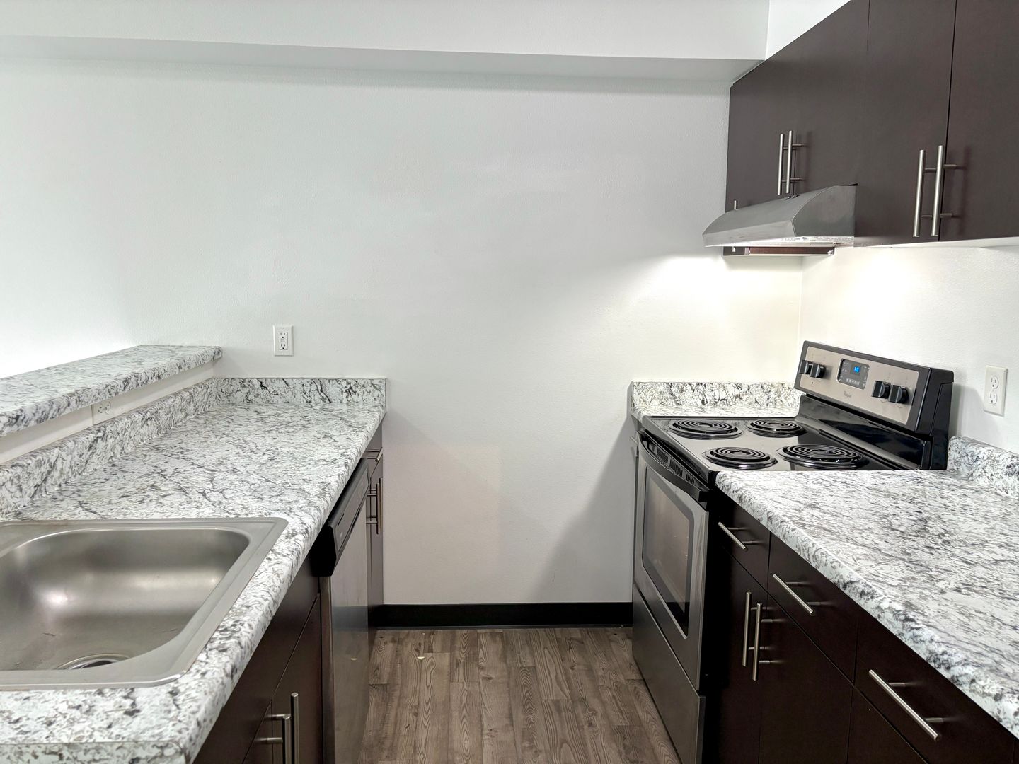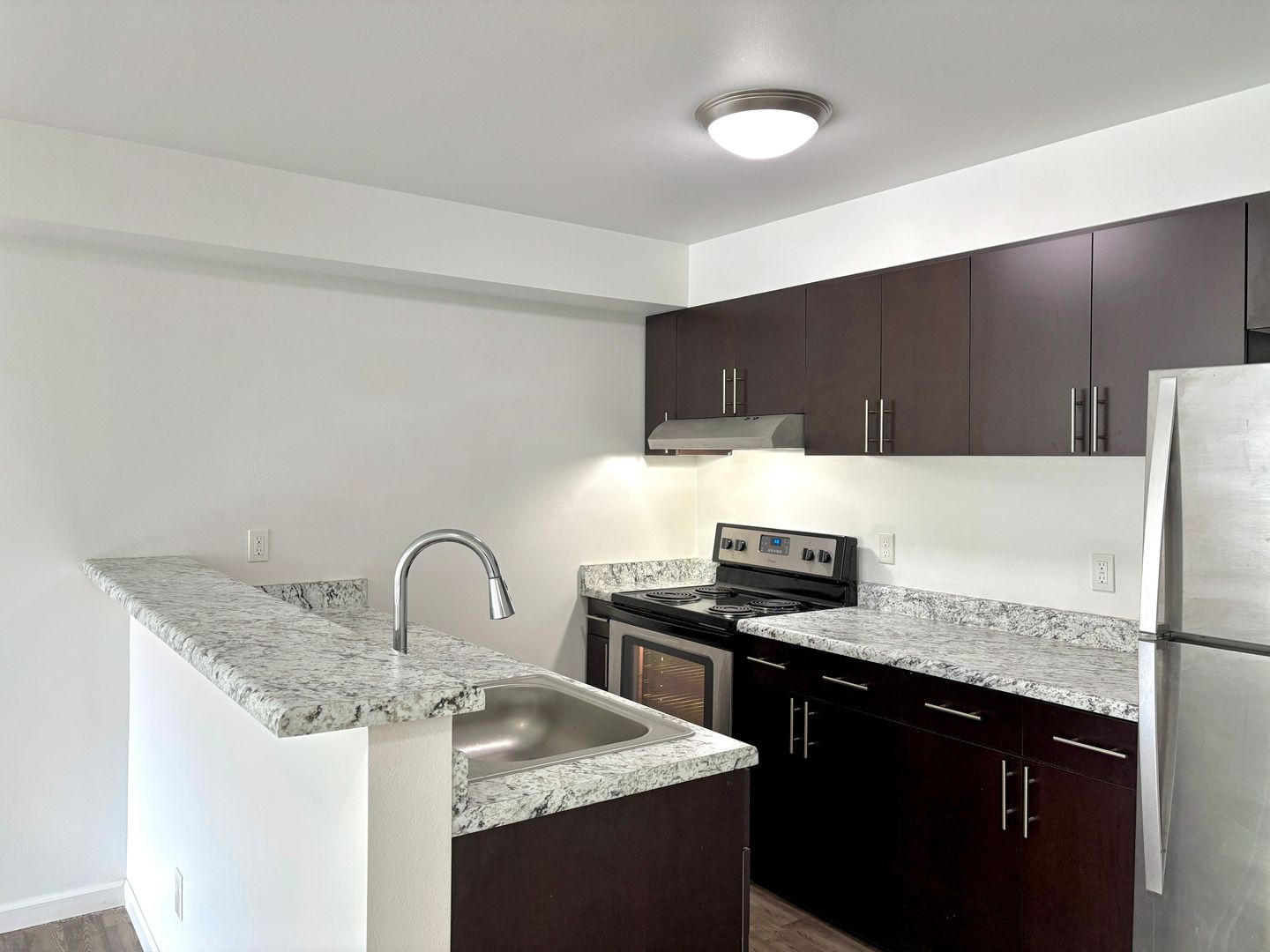 - Efficient kitchen layout with plenty of cabinet space, stainless refrigerator, coil top electric range and dishwasher