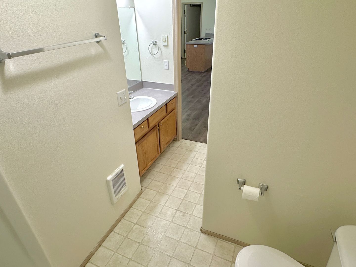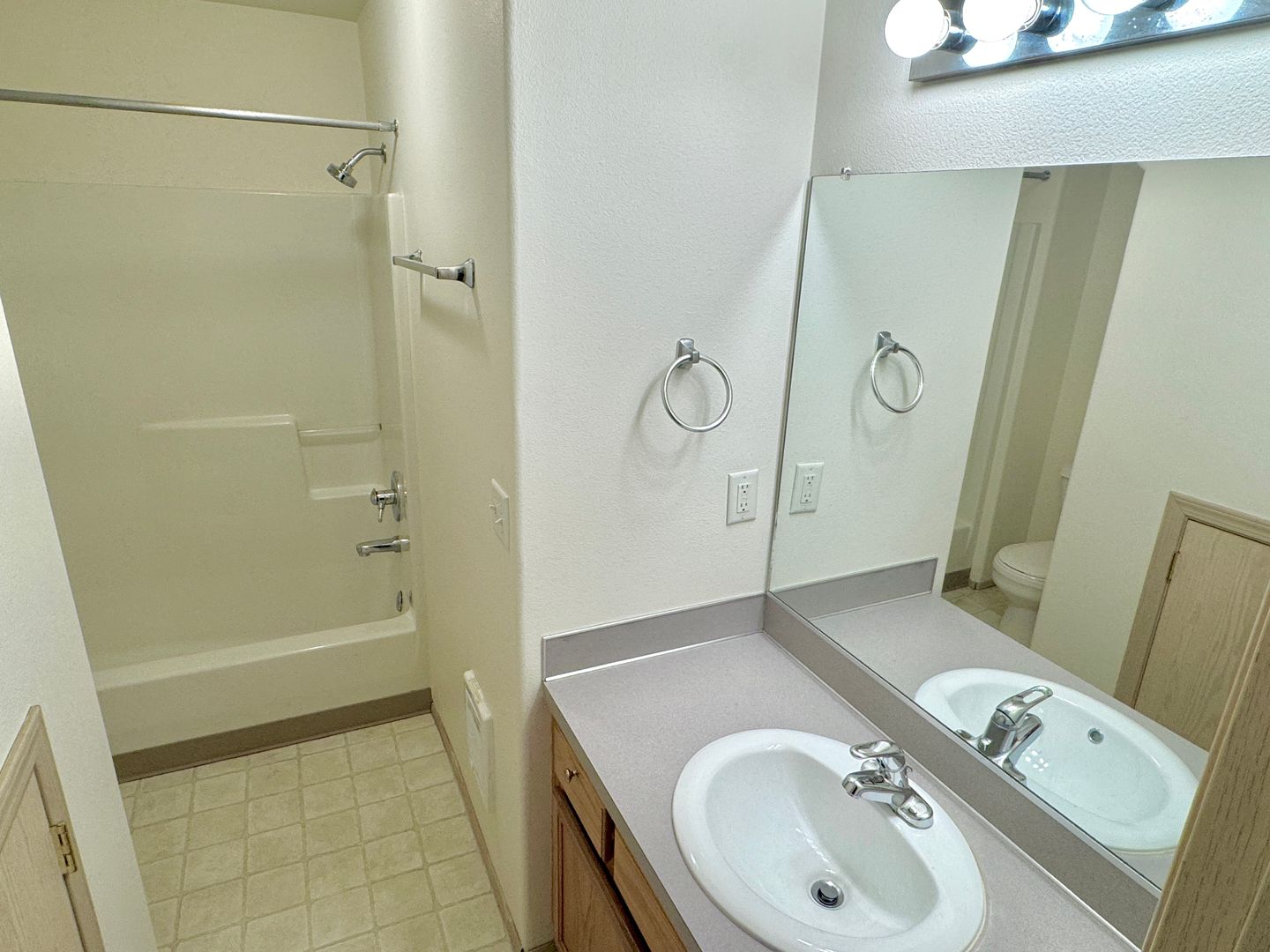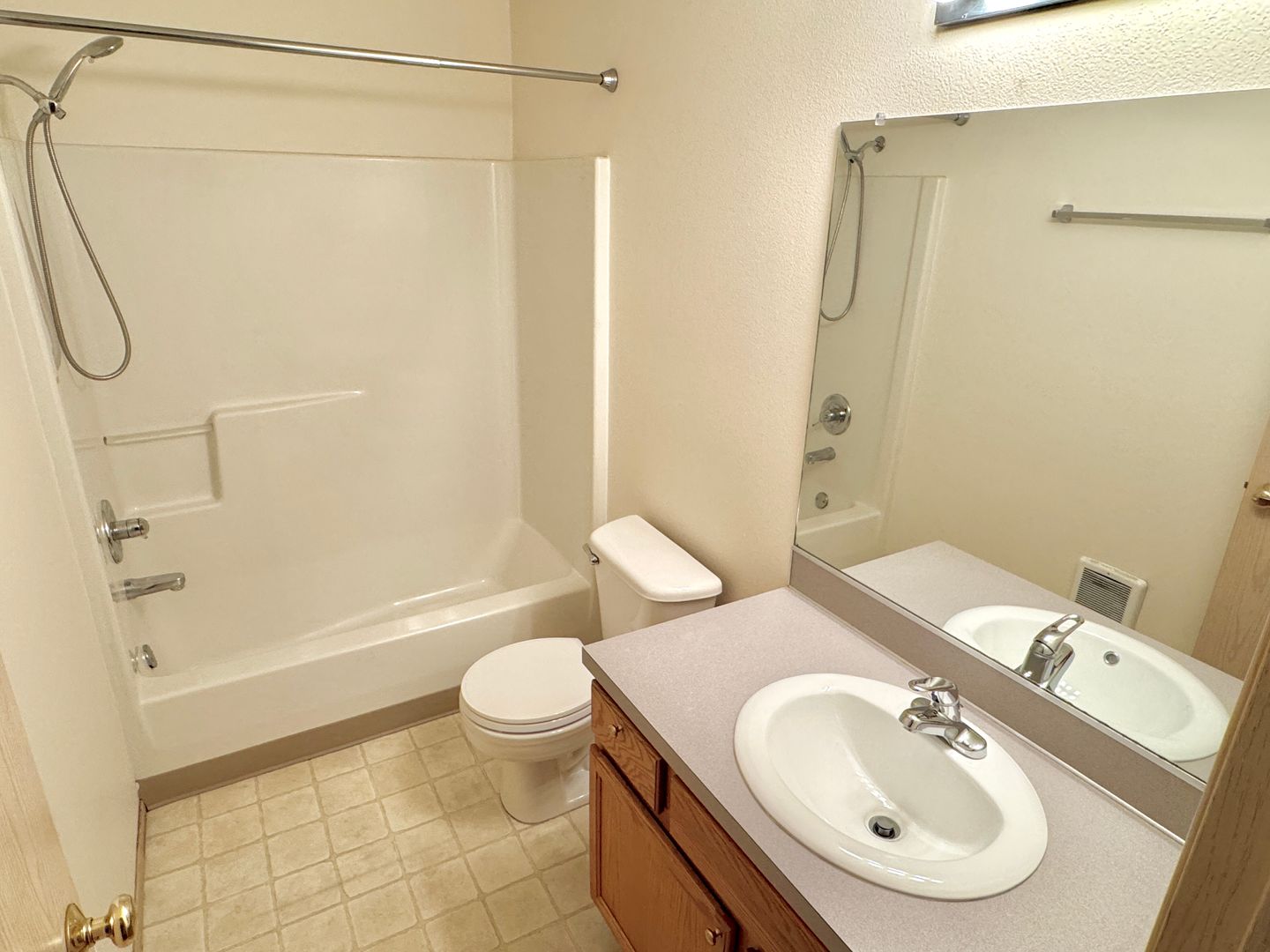 - Full bathroom, formica vanity, linoleum flooring, full-sized shower/tub with 1-piece vinyl surround