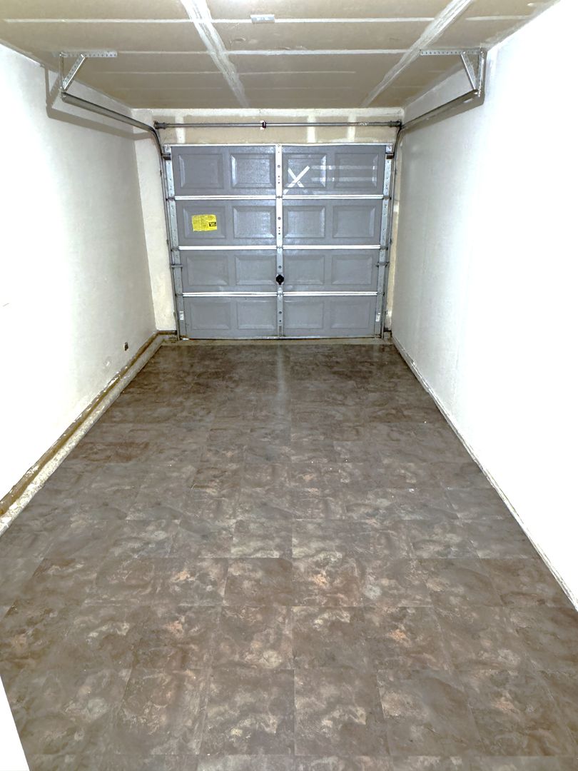 - Deep, single car garage accessed off of kitchen, with manual door, linoleum flooring