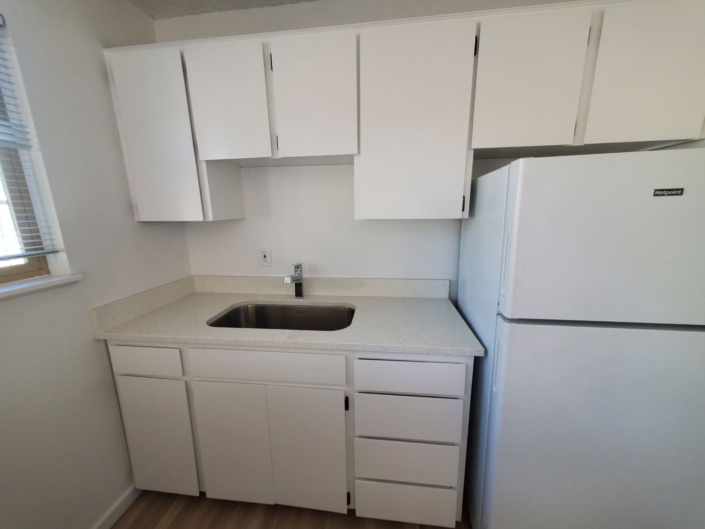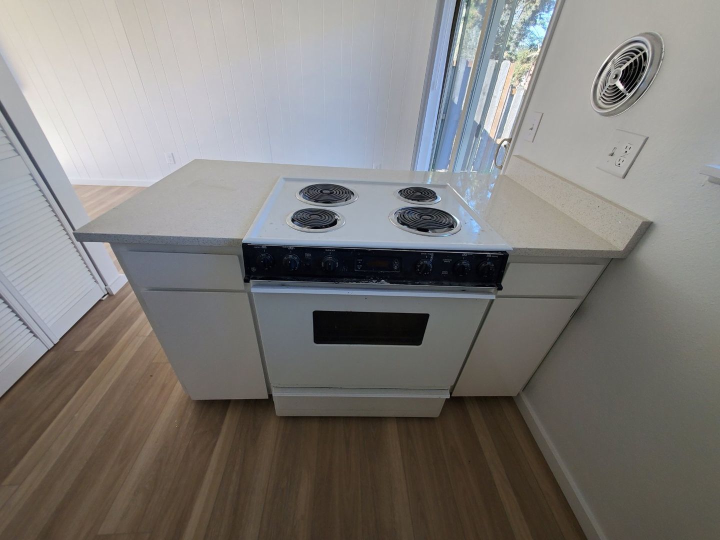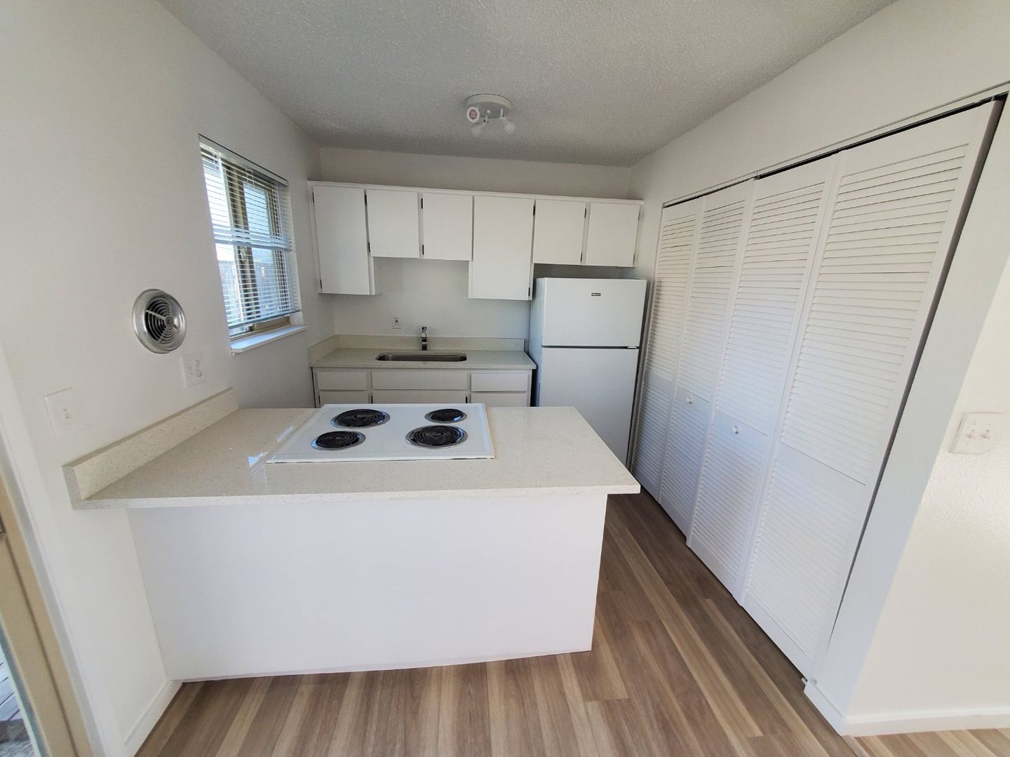 - Cute kitchen with counter open to small dining area, electric drop in range, fridge, quartz countertops with tile backsplash, pullout stainless steel faucet, and lots of cabinet space