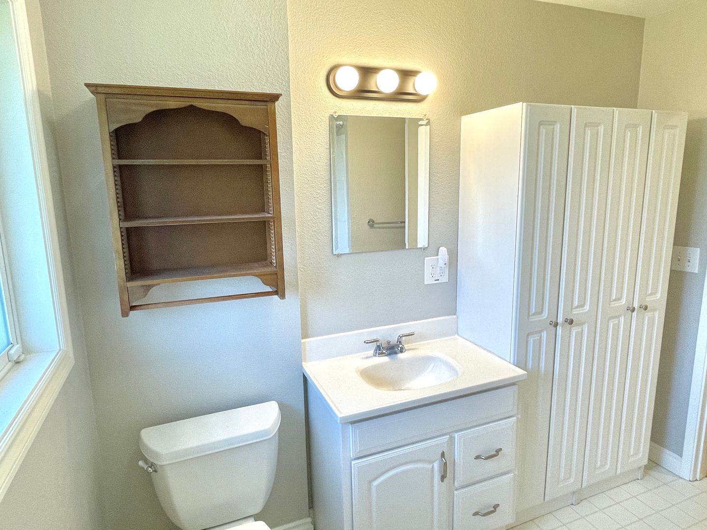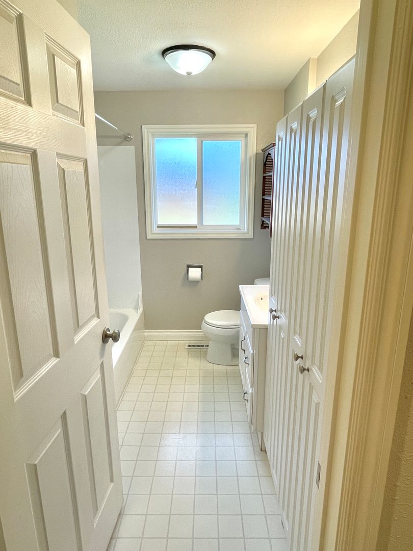 - Bathroom has vinyl flooring, shower/tub, single sink and large storage cupboard.