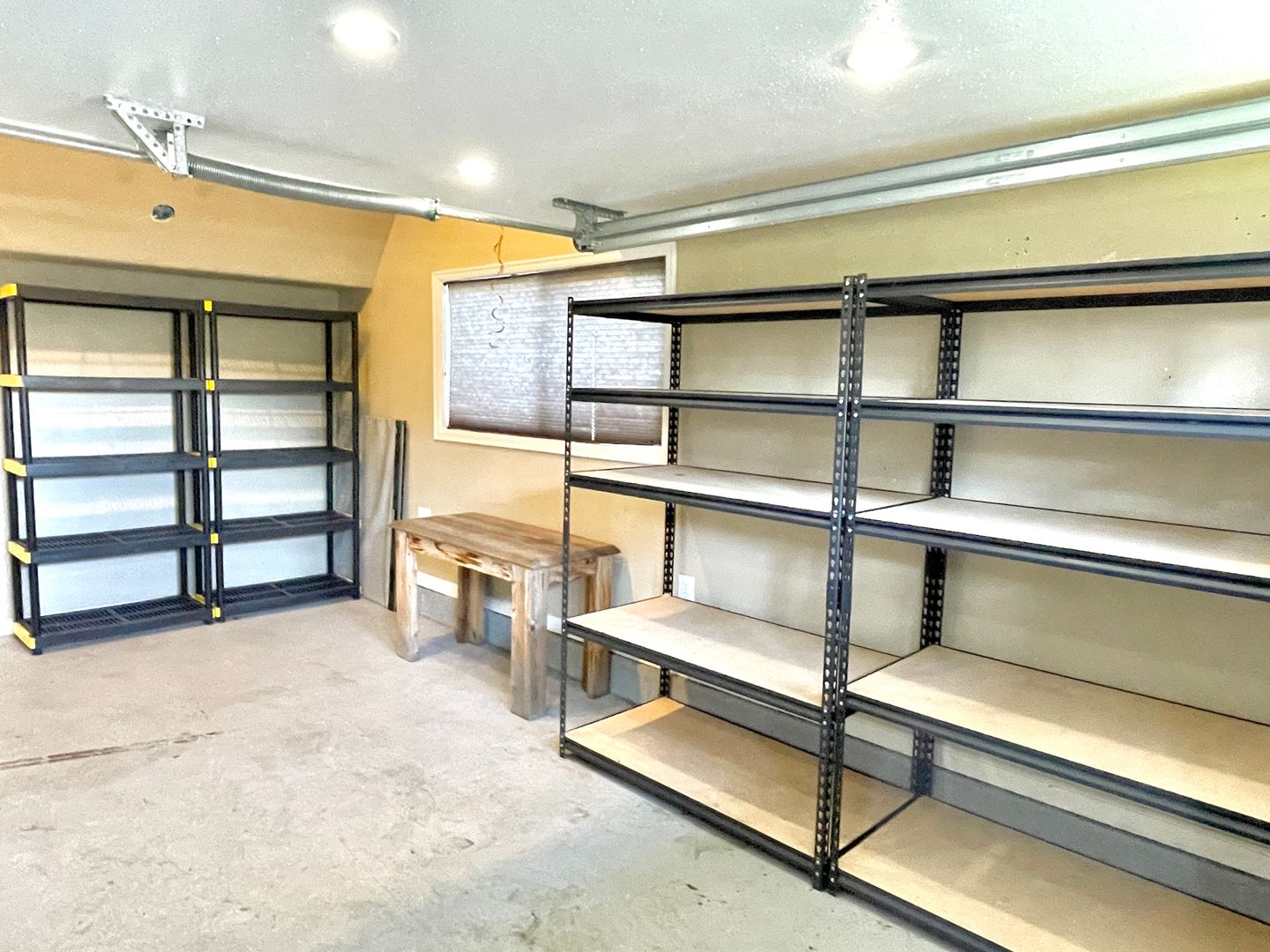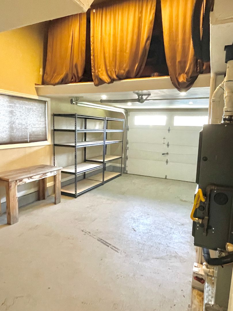 - Attached garage has manual door and shelving. Loft space in garage for additional storage.