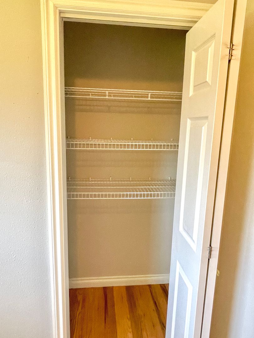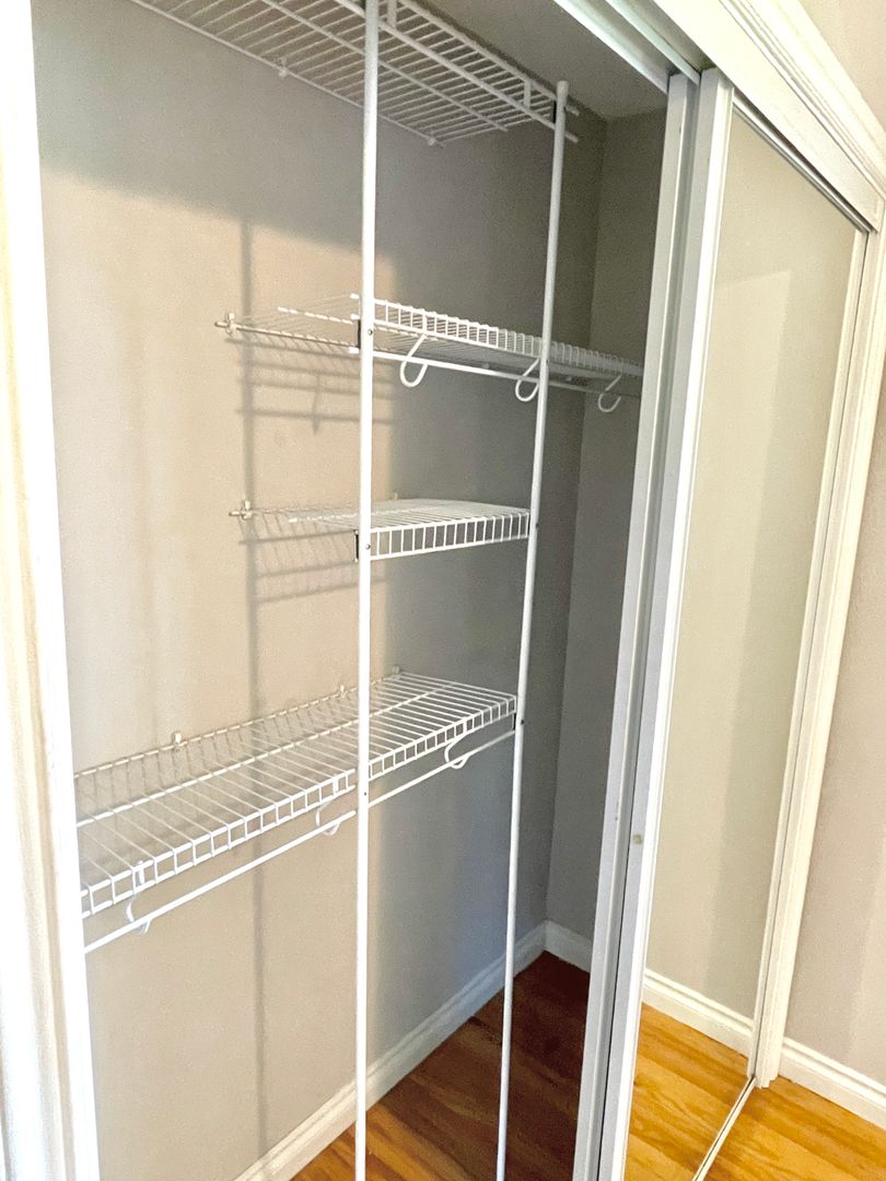 - Primary bedroom has double closet with installed shelving system.
