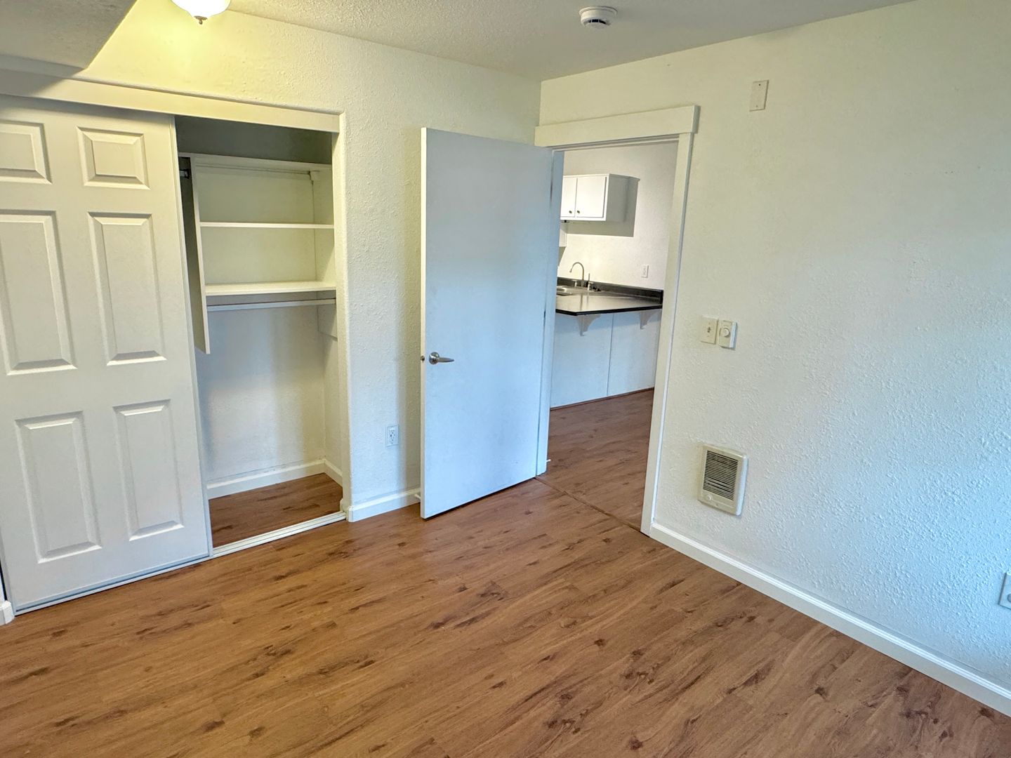 - Separated bedroom locations split by kitchen and living area, both with laminate hardwood flooring