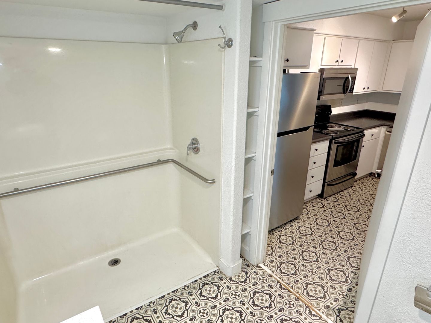 - ADA accessible bathroom with linoleum flooring, seamless entry to double-wide shower stall, vanity with laminate countertop