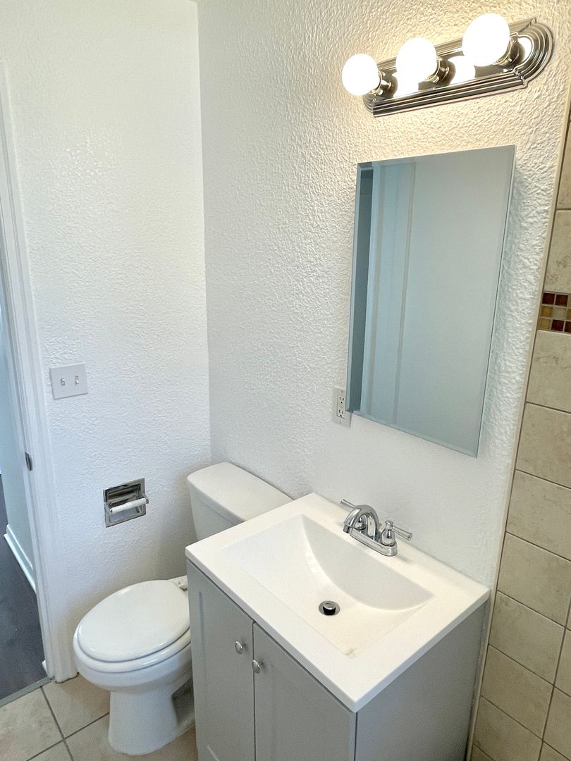 - Updated bathroom with full shower/tub, tiled flooring and backsplash