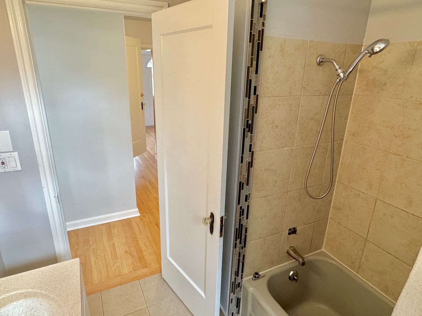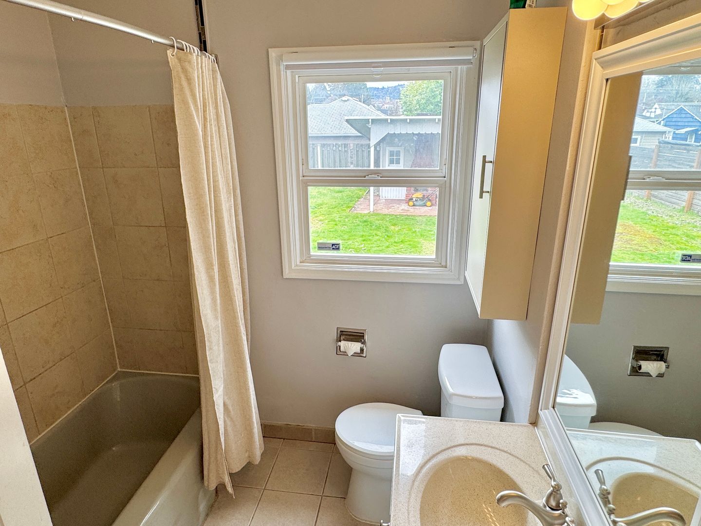 - Bedrooms are split by full bathroom, with tiled floors, tiled surround on shower/tub