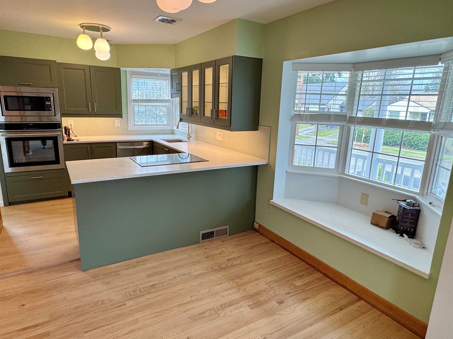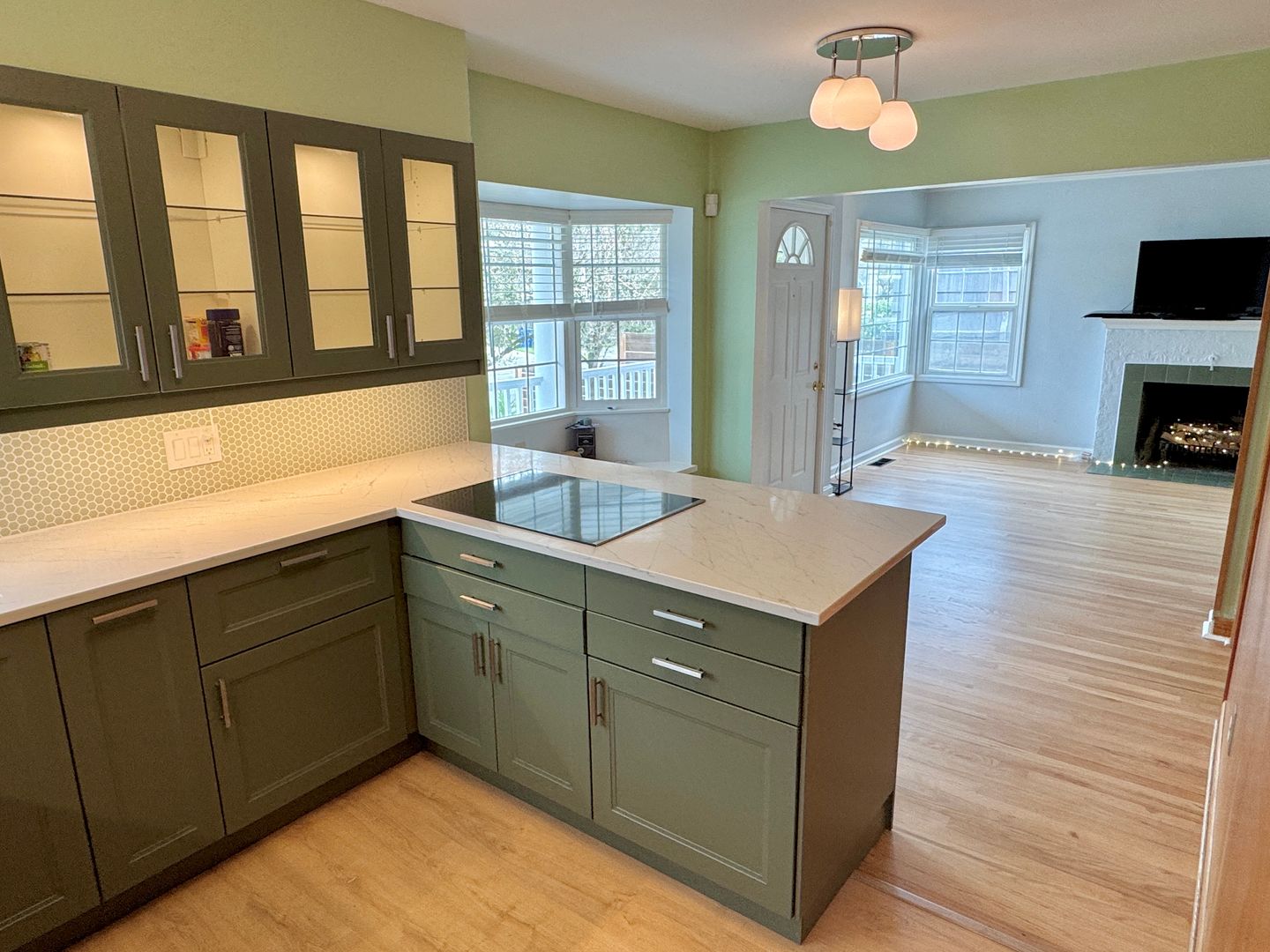 - Newly renovated kitchen, quartz countertops, new cabinetry with custom lighting, electric cooktop range, built-in oven and microwave oven, dishwasher, disposal