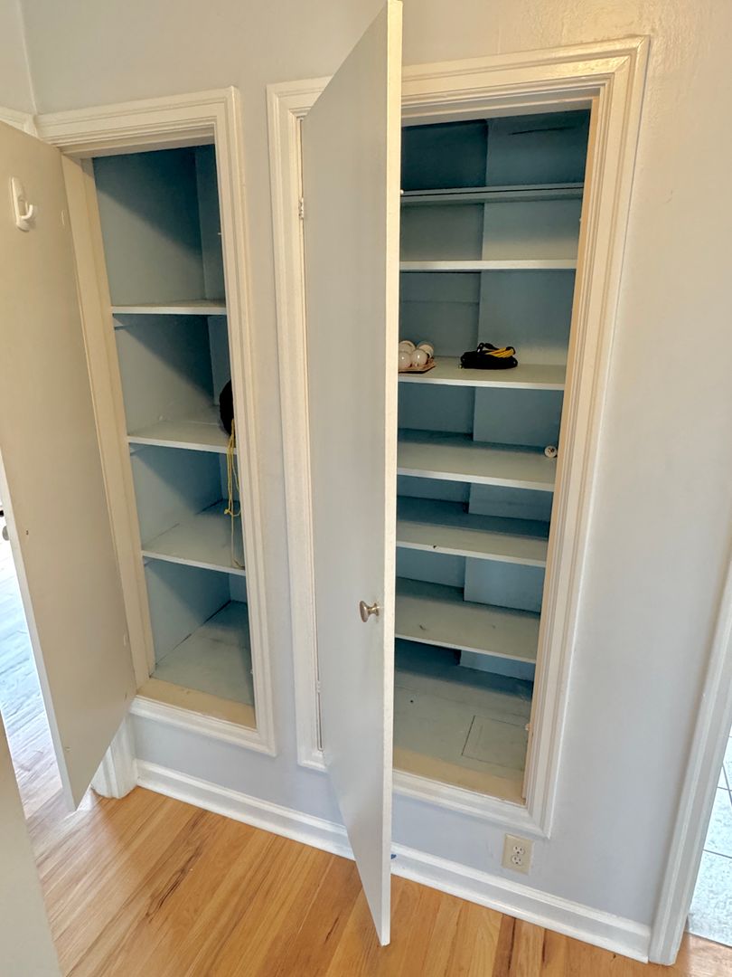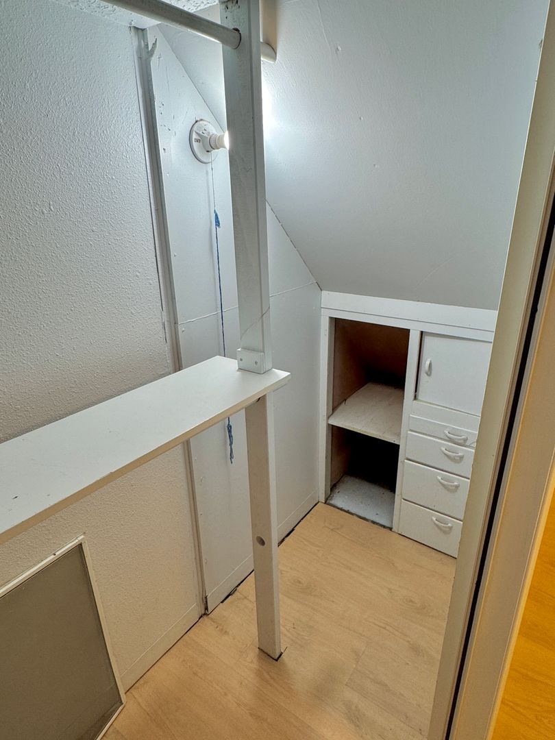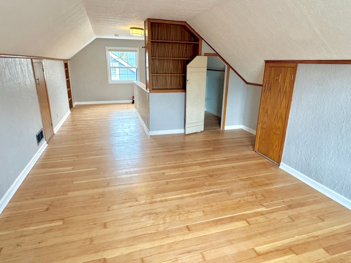 - Fully finished attic bedroom with hardwood flooring, ample built-in shelving and deep closet