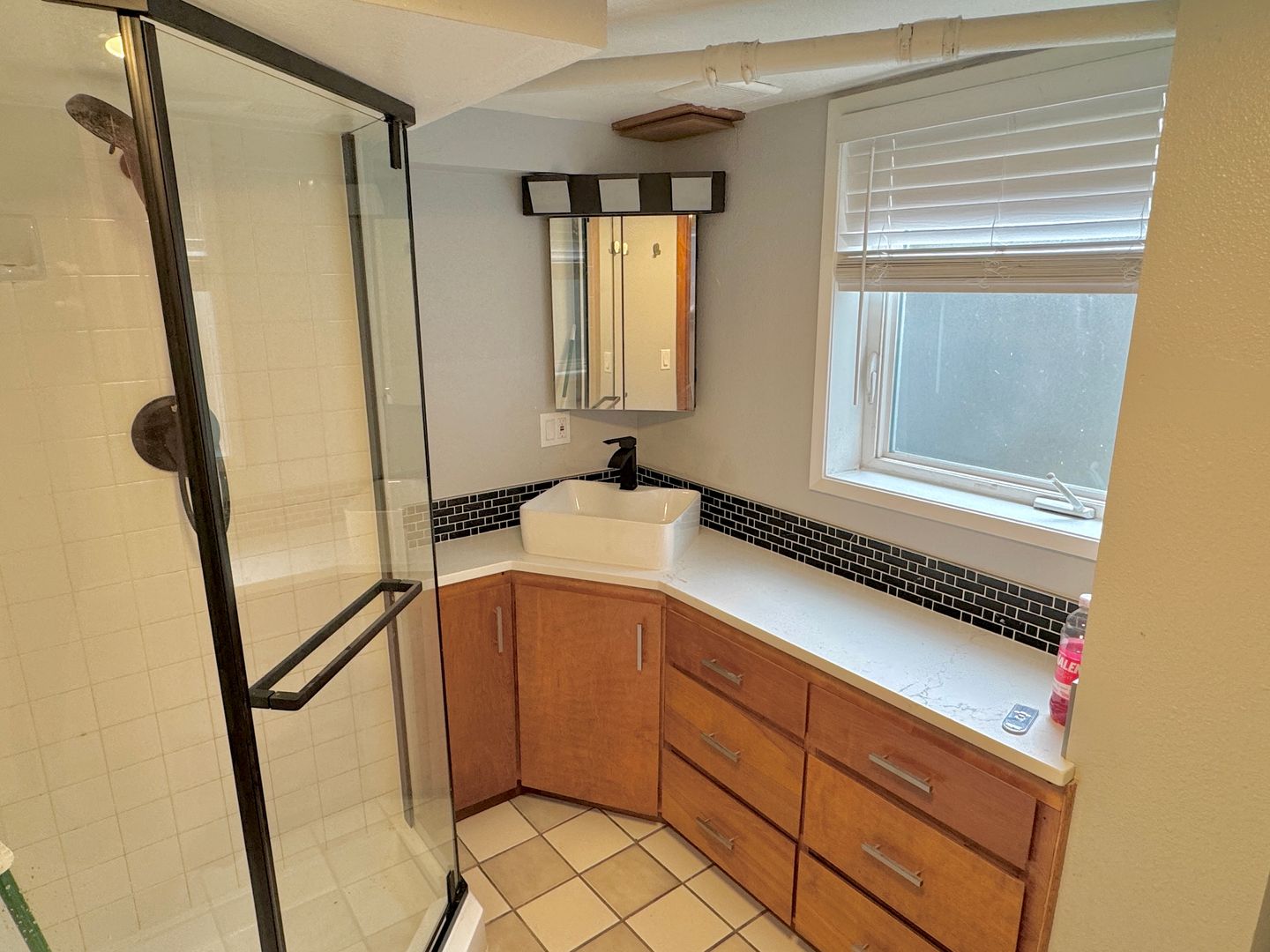 - Full bathroom with tiled flooring, glass enclosed shower stall, tiled backsplash and updated sink