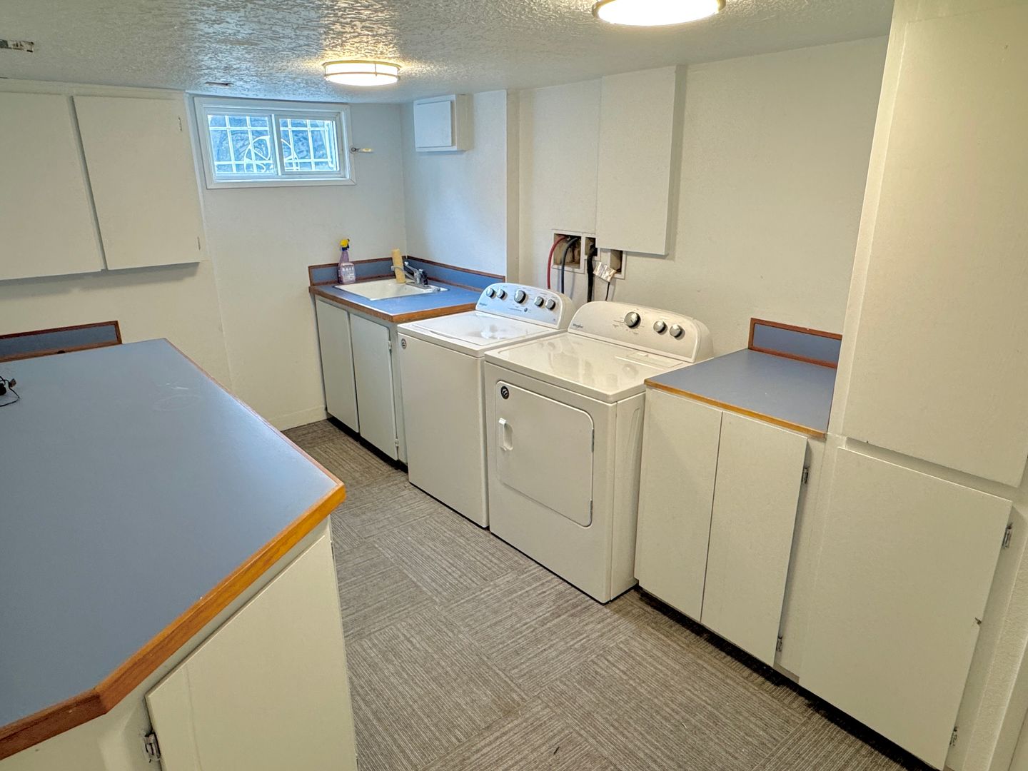 - Large laundry room with utility carpet flooring, tons of countertop and cabinet space, deep sink, and full-sized side-by-side Washer/Dryer (W/D) included