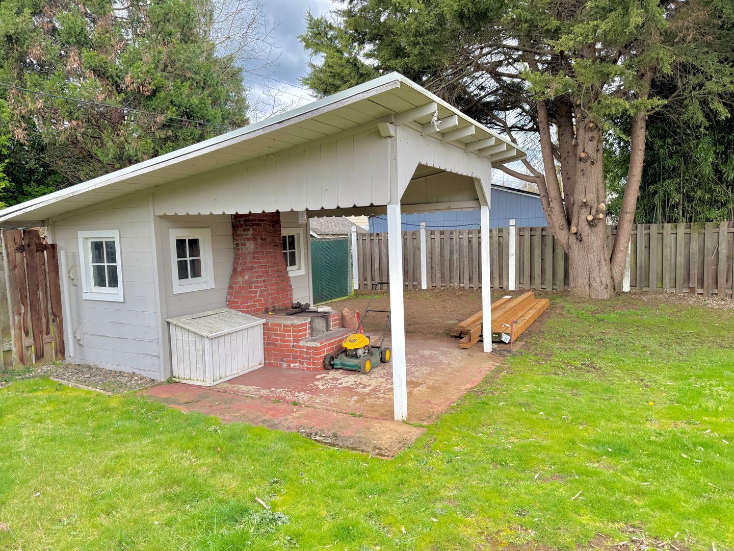 - Huge backyard, nearly fully fenced (small section aside house is not fenced currently), with a storage/tool/gardening shed and additional covered seating area with decorative fire pit (not for Tenant use)