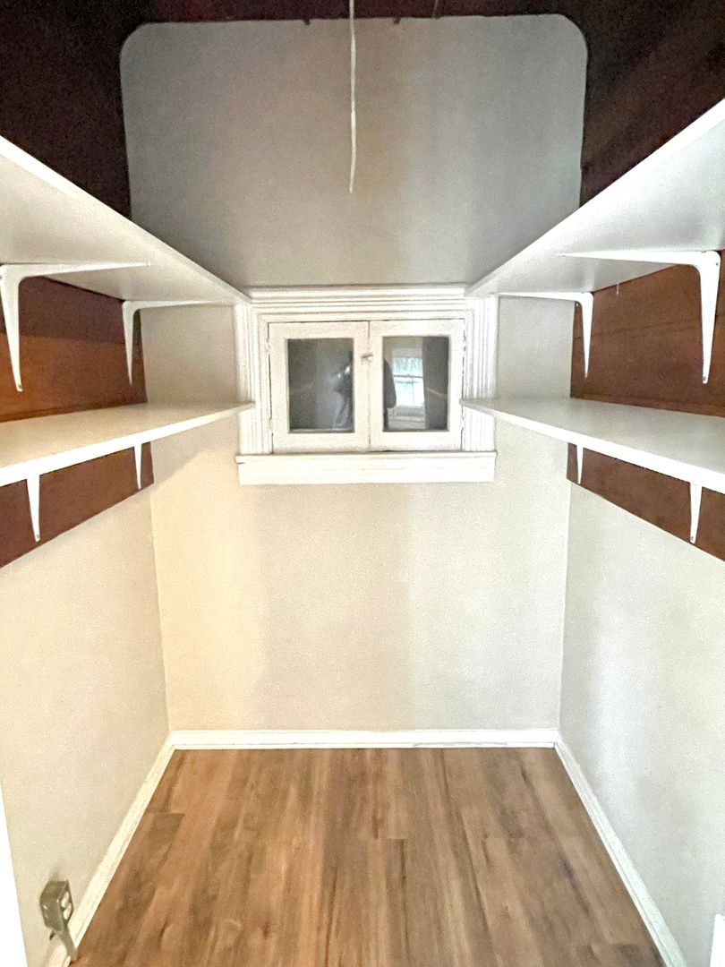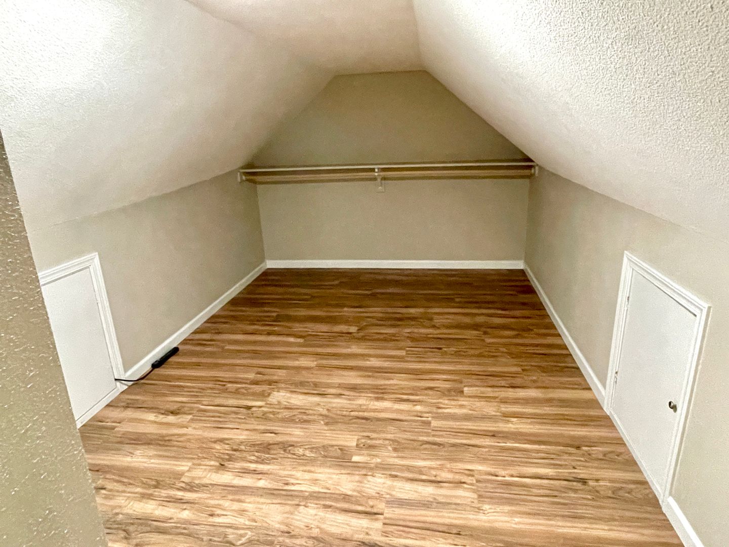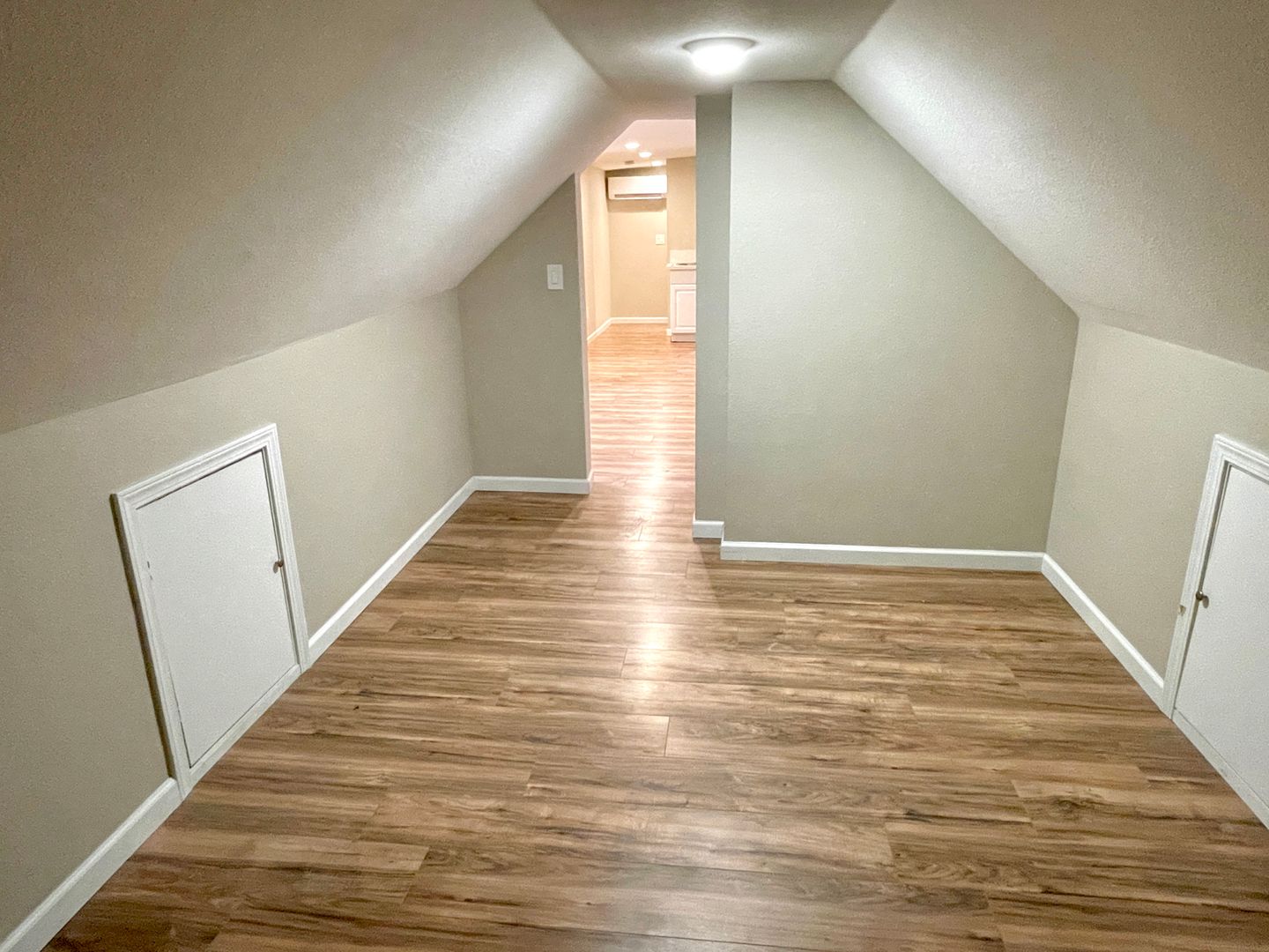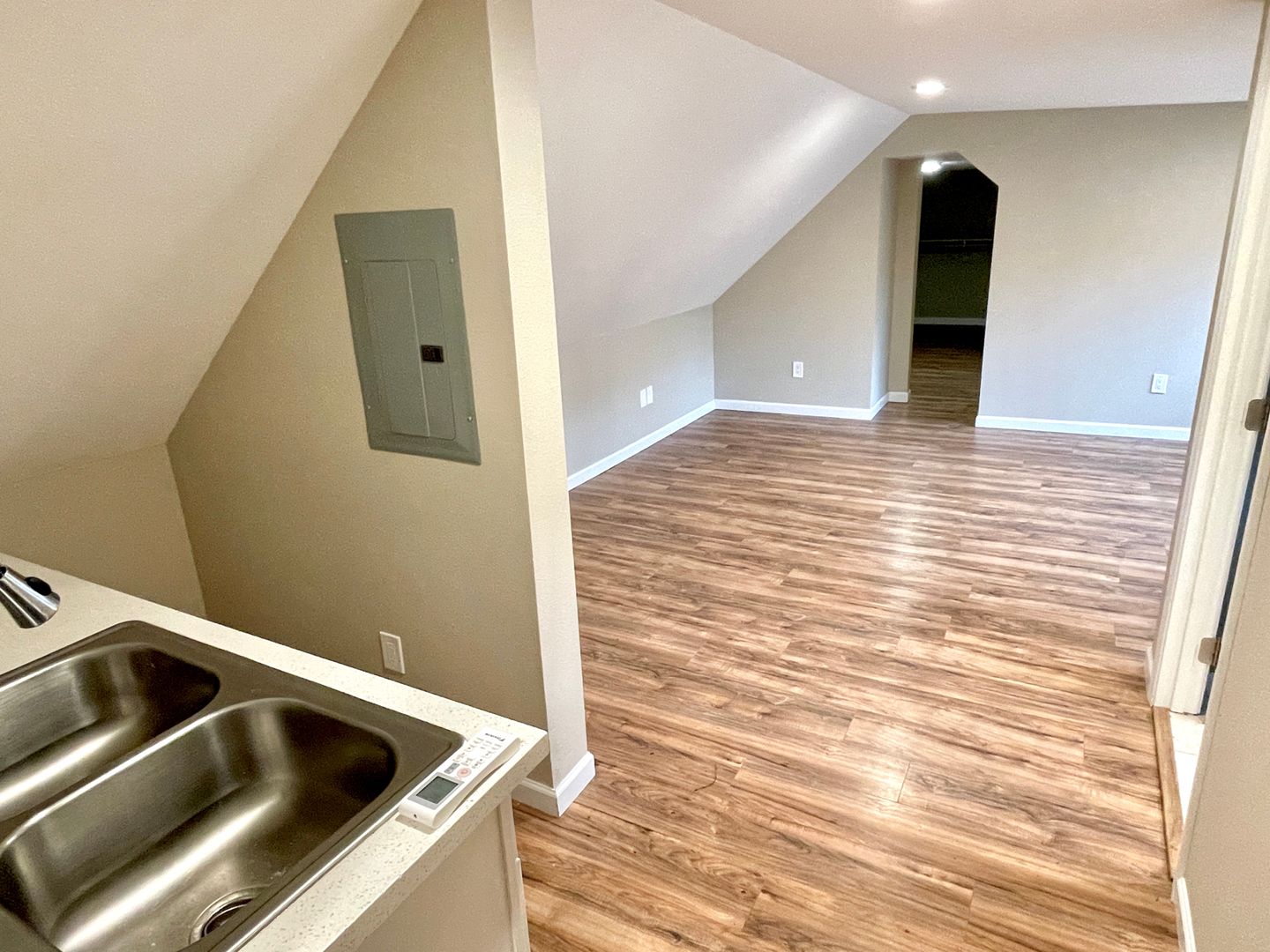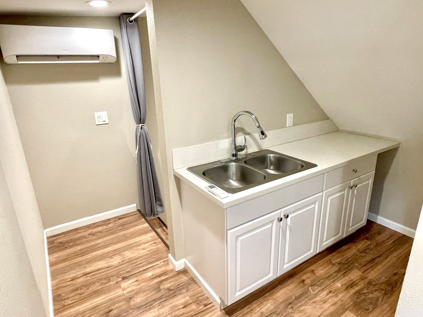 - 2nd story with kitchenette (sink and counter, no stove), 2nd living room space, and separated bed area.