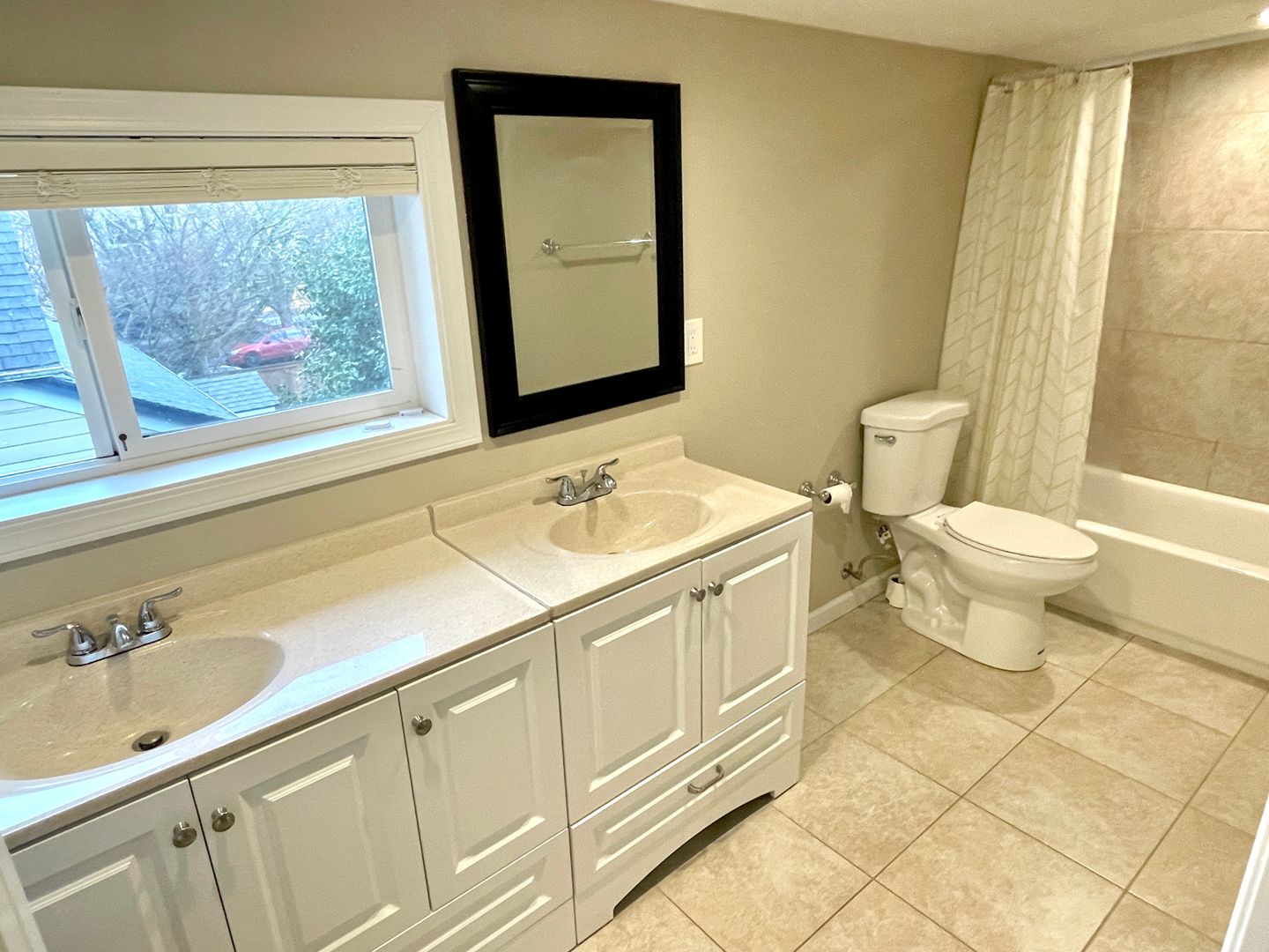 - 2nd floor bathroom, fully remodeled, tiled flooring, double sinks, full tub/shower with tiled backsplash