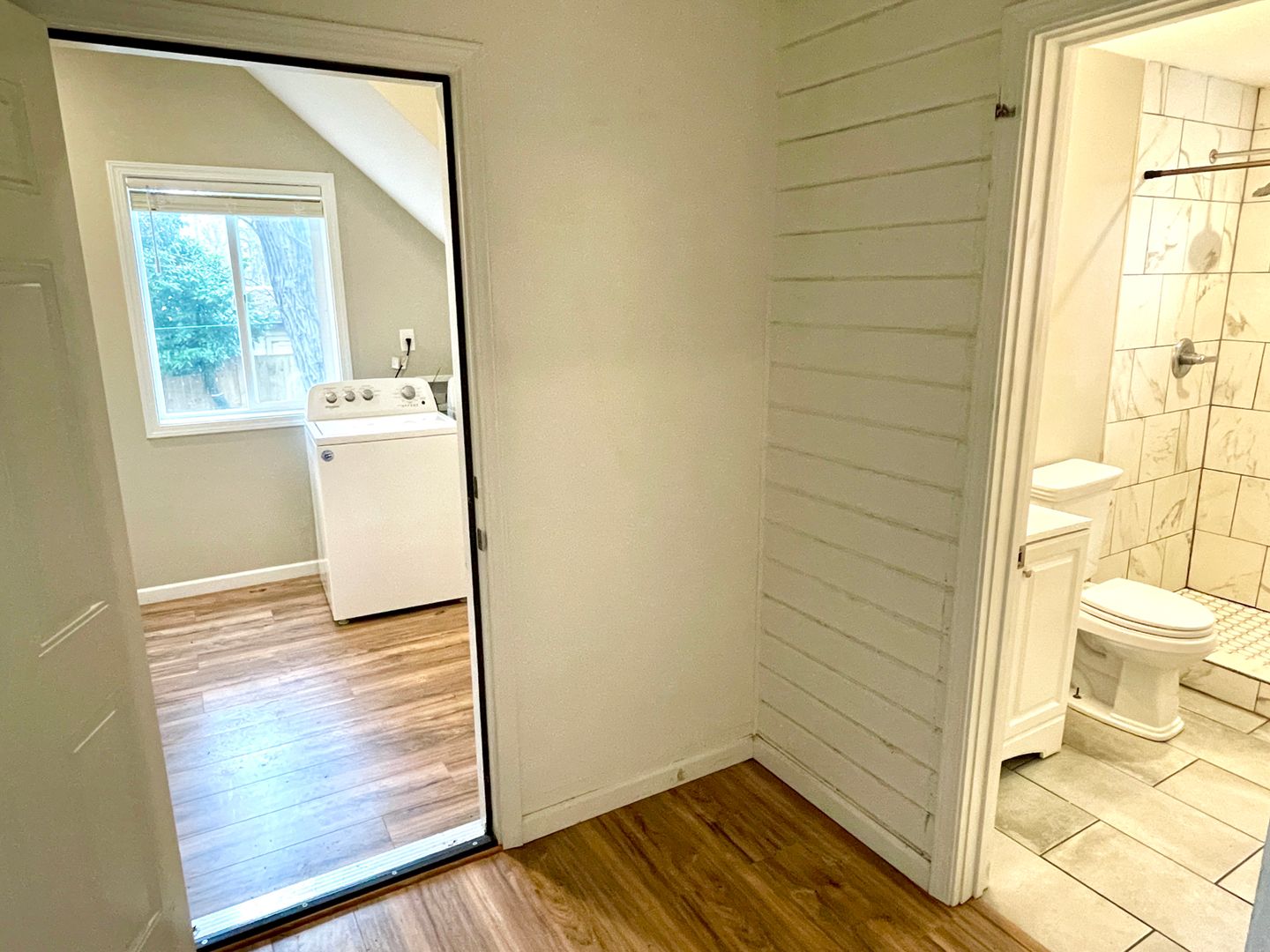 - Open laundry room with backyard access, storage space, Washer/Dryer
