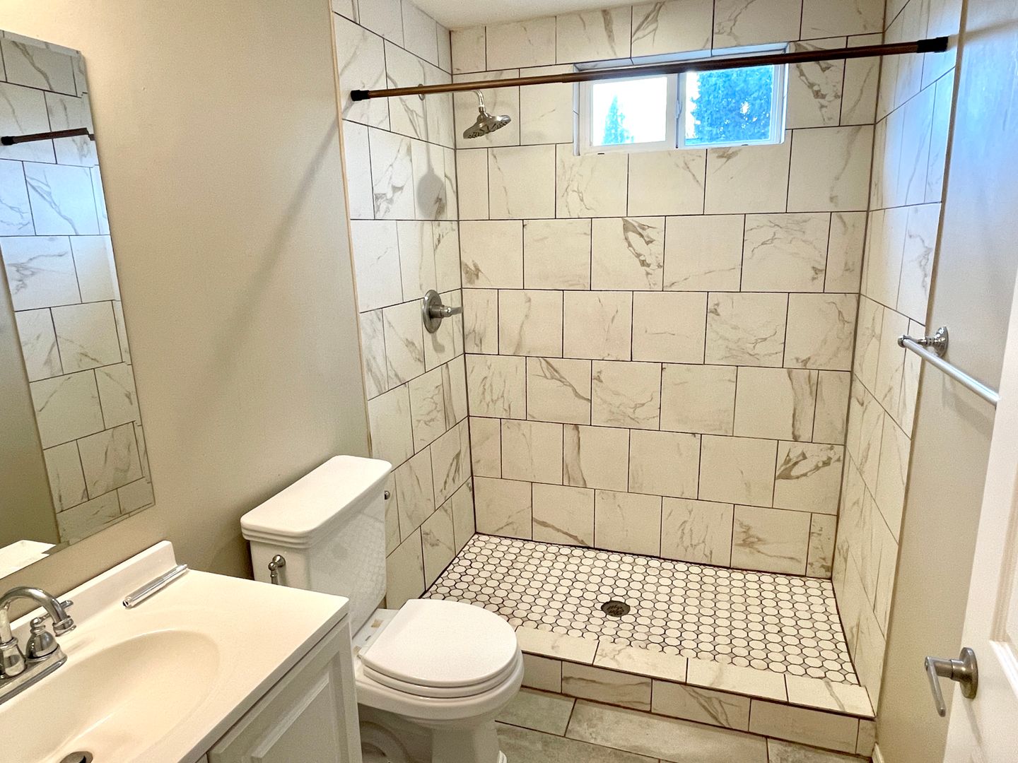 - Remodeled main floor bath with floor-to ceiling tiled step-in shower, tiled floors