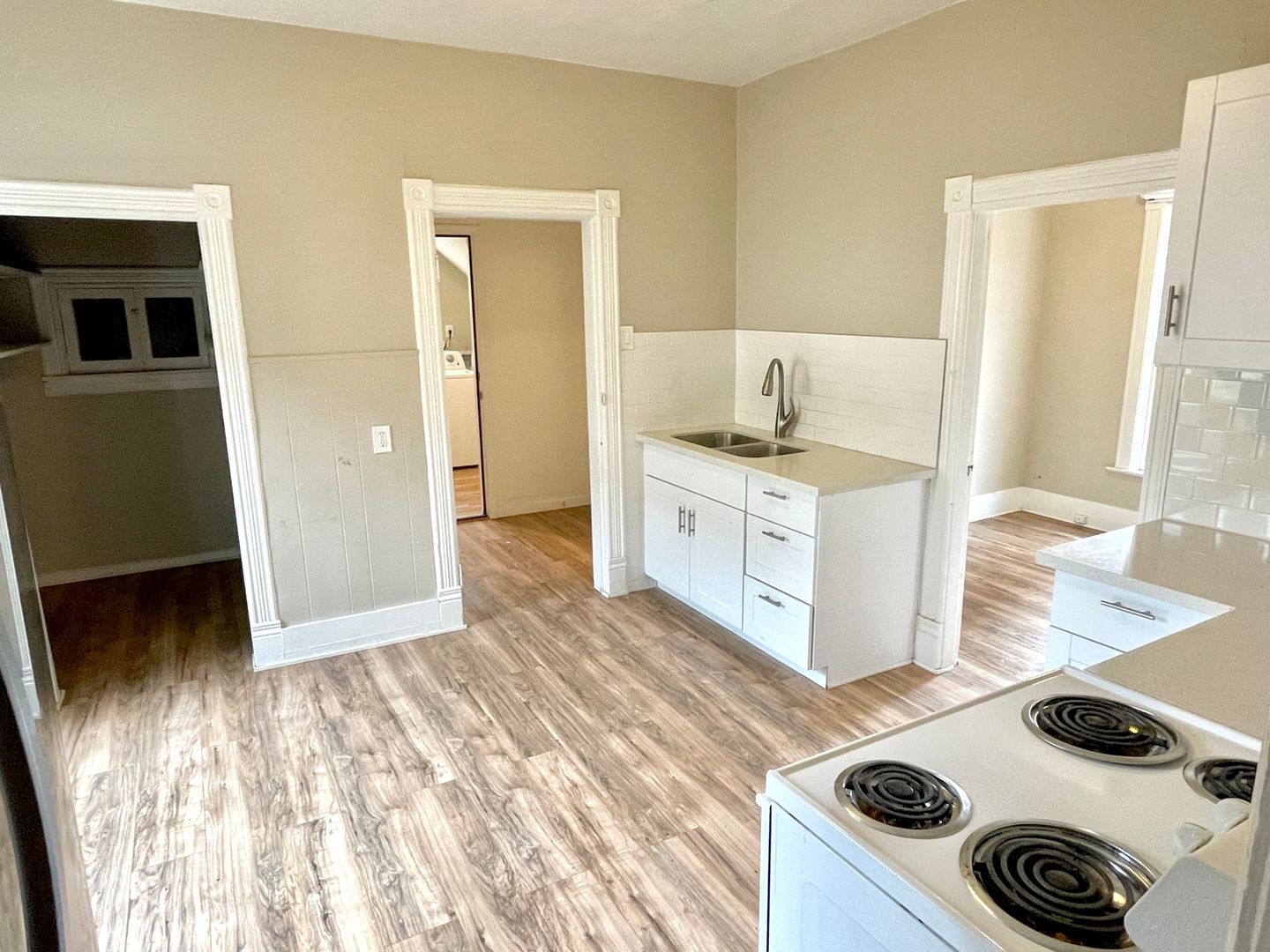 - Large kitchen with laminate flooring, upgraded countertops and cabinets, tiled backsplash, oversized fridge, coil electric range, huge food pantry