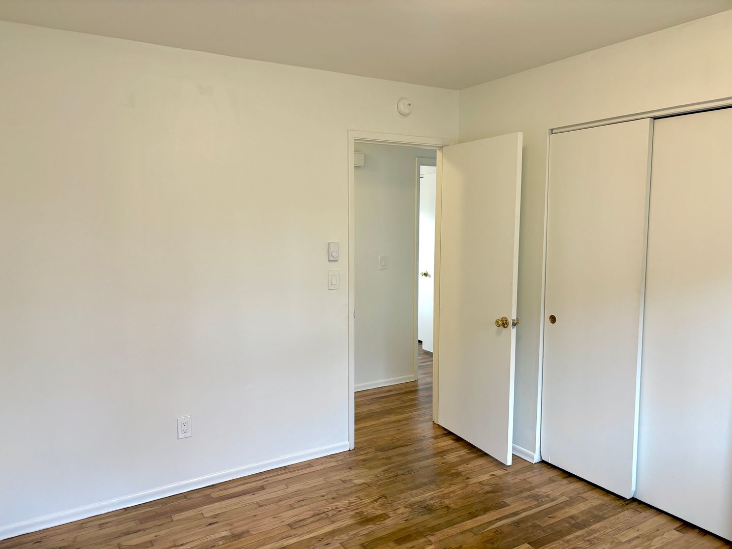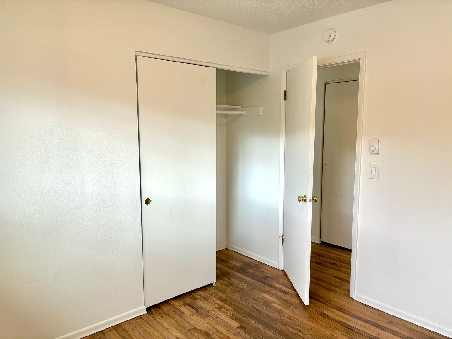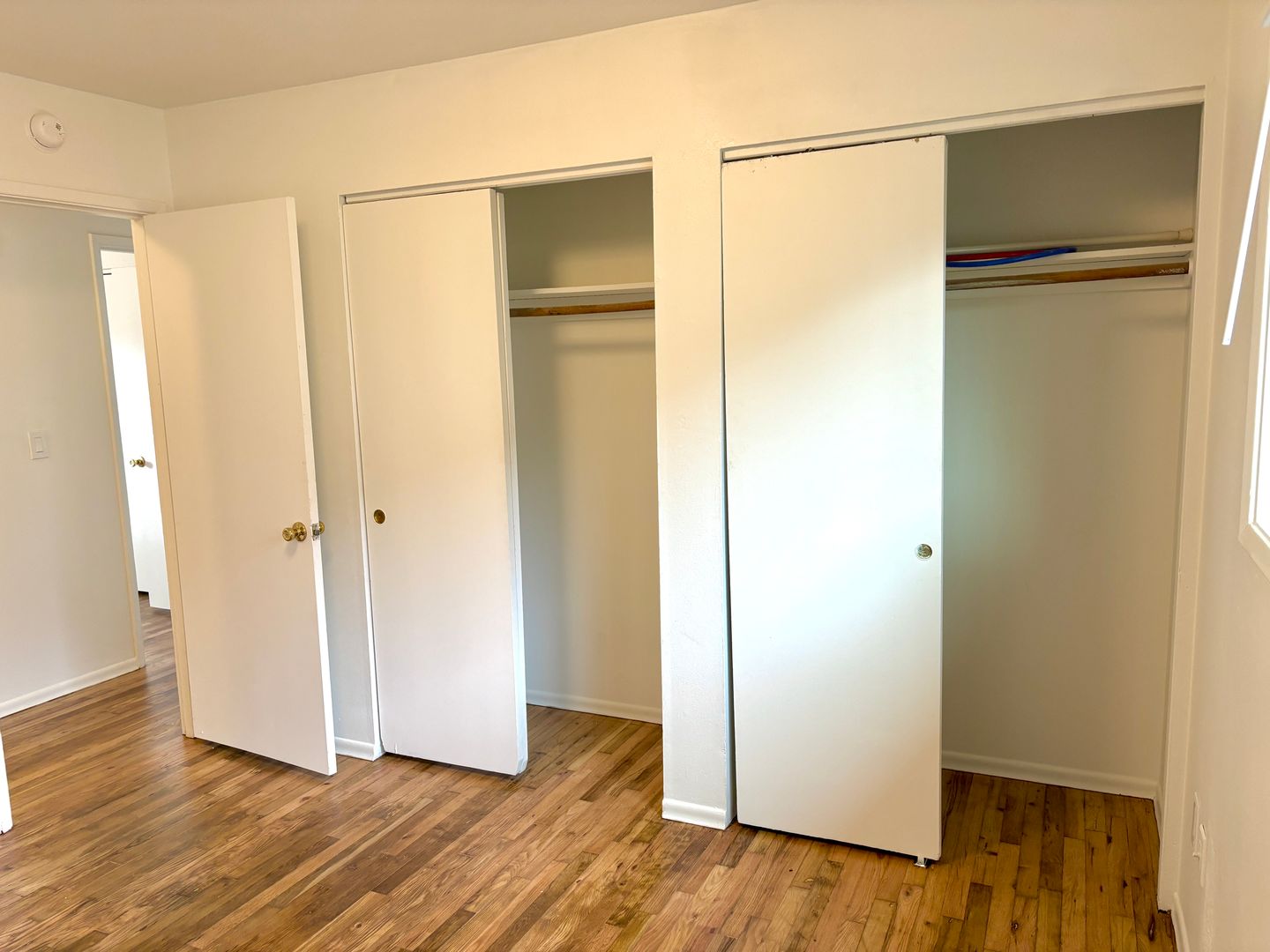 - 2 standard sized bedrooms split by hallway, each with hardwood floors. Larger bedroom has 2 double wide closets