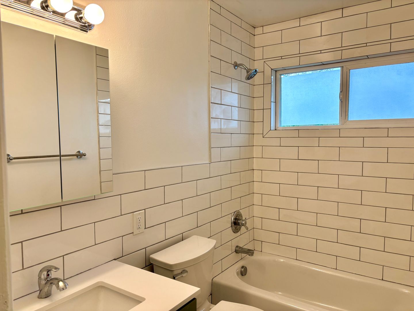 - Bathroom with tiled flooring, updated vanity, floor to ceiling tiled shower surround with full-sized tub, window and fan for ample ventilation
